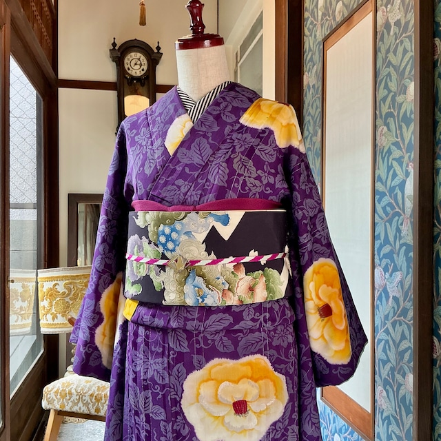紫影に咲く金椿*紫 パープル 黄色 つばき 花 ハロウィンカラー アンティーク小紋着物 B276