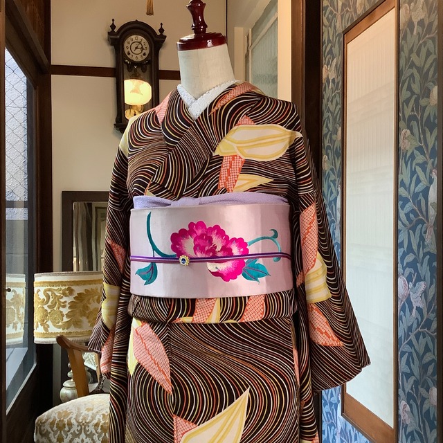 黒地にお花が描かれた袷のアンティーク小紋着物です ピンク系の木の枝と枯葉のような模様が蜘蛛の巣のようにも見えて、クールさと、ちょっぴり毒っけのあるデザイン♡ 今の時期なら、ハロウィンコーデにもぴったりですね♥ シックな地色で、幅広い年代の方に似合うアンティークです◎ 裏地の八掛が絶妙なパープル系のカラーでおしゃれ♩ 着物の中にハイネックやブラウスなどを着たり、裾からプリーツスカートを覗かせたり、ブーツや帽子を合わせたり、洋装ミックスも素敵ですね ○合わせたアンティーク名古屋帯、オリジナル帯揚げオーキッドピンク、オリジナル三分紐しましまモノクロもwebshop掲載品です♪ その他は店主私物のため非売品 ○掲載画像は、実際の色味に近づける努力を精一杯しておりますが、お使いの画面やブラウザによって写真と実物の色味が違って見える場合もございます。ご了承ください。 ◇仕立て◇ 小紋 袷着物 バチ衿 ◇着用時期◇ 10月頃〜5月頃 ◇サイズ◇ 裄 61cm 身丈(肩から) 148cm 袖丈 49cm 前幅 23cm 後幅 29.5cm ⭐︎標準体型の方でしたら、身長より身丈が7センチほど短くてもおはしょり取れることが多いです。 それ以上短い場合は、おはしょりナシで着る対丈や、ブーツやスカートなどを合わせて洋服ミックスコーデなど工夫すれば着られます♪ 長い分には、身長より身丈が10センチ長いくらいまでは腰紐の位置を上げるなどして調整可能です。 *適応身長について詳しくはこちらをどうぞ♪ ☟☟☟ https://ameblo.jp/kimonoyatento/entry-12254617641.html?frm_id=v.jpameblo&device_id=178b8fc24fe34d00a6064a9c34f716d3 ◇素材◇ 表地裏地ともに正絹 ◇状態◇ 状態ランク 【 アンティーク S 】 特に難など無く美品です✨ 裾と袖にしつけ糸付き。 *その他、表記にないアンティーク特有の染めムラや織ムラ、くすみなどが僅かに見られる場合があります。 +-+-+-+-+-+-+-+-+-+-+-+-+-+-+-+-+-+ 状態ランク アンティーク S ・・・ アンティークにしては目立つ難など殆ど無く超美品✨70〜100年近く前の時代のものとは思えない状態の良さ✨ アンティーク A ・・・ 裏や着れば見えづらい所に少々アンティーク特有の難などはありますが、着用には問題ない程度!アンティークとしては美品と言えます✨ アンティーク B ・・・ 見える所にも少々アンティーク特有の難などありますが、アンティークに慣れた方でしたら着用には問題ない程度! アンティーク C ・・・ 見える所にも大きめ又は多数、アンティーク特有の難などありますので、細かいことよりデザイン重視!のアンティーク愛強めの方にオススメ! *状態の感じ方には個人差がありますので、アンティークに馴染みの無い方、完璧をお求めの方はご購入をお控え頂くとよいかと思います。 +-+-+-+-+-+-+-+-+-+-+-+-+-+-+-+-+-+ ◇ご注文の際の注意点◇ ○店舗でも同時に販売しているため、ご購入手続き、カード決済をしていただいても店舗では完売している場合がございます。 大変申し訳ございませんが、その際はご注文の取消と返金(カード会社へ決済キャンセル)させていただきますので、ご了承ください。 ○銀行振込みの方は5営業日以内、コンビニ振込みの方は5日以内にご入金がない場合は自動キャンセルとなりますのでご注意ください。 ○商品のお届けは、ご注文(入金確認)後、5日以内に発送いたします。 イベント出店前後など、すぐに発送できない場合もございますので、お急ぎで必要な方はご了承ください。 ○店舗受取りも可能です。 ご注文時、備考欄に『店舗受取り希望』とご記載ください。その際、送料分もお支払いいただいた方には、お店で送料分を返金いたしますのでお知らせください。 どうぞよろしくお願いいたします。