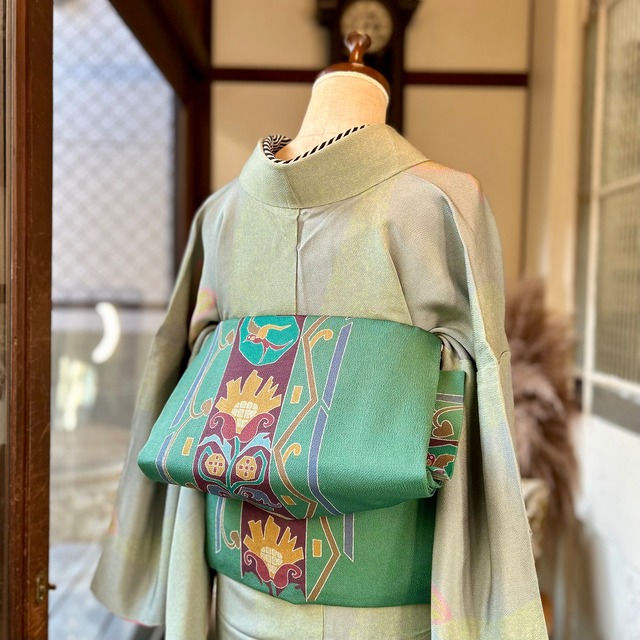 少し落ち着いた青緑系のスレートグリーンの地色に幾何学模様や花や鳥が描かれたちょっぴり異国情緒溢れる、ちりめん地の名古屋帯です ふっくらとシボを帯びたちりめん地に、鳥や花、幾何学的なデザインがオリエンタルな雰囲気で素敵✨ モチーフの花は少しクラシックさもあり、ワインレッドやオレンジ、ブルーなどで彩られたデザインがお洒落ですね♡ 異国へ旅するような、ワクワクと好奇心をくすぐられるような、そんな魅惑的なコーディネートをしたくなりますね✨ ○合わせた着物と帯締め、オリジナル帯揚げミルクティベージュはweb shop掲載品です♪ その他は店主私物のため非売品となります。 ○掲載画像は、実際の色味に近づける努力を精一杯しておりますが、お使いの画面やブラウザによって写真と実物の色味が違って見える場合もございます。ご了承ください。 ◇仕立て◇ 名古屋帯 ◇合わせる着物◇ 小紋や紬、お召、デニム着物などのカジュアルな着物に◎ ◇サイズ◇ 長さ 383cm 幅 31cm ◇素材◇ 正絹 ◇状態◇ 状態ランク【リサイクル S】※ 特に難など無く美品です✨️ +-+-+-+-+-+-+-+-+-+-+-+-+-+-+-+-+-+ ※ リサイクルS ・・・ 未使用、未使用同然の超美品✨ リサイクルA ・・・ わずかな使用感、または裏や着用すれば見えづらい所に少々の難などがありますが、着用には問題ない程度の美品✨ リサイクルB ・・・ 見える所にも少々の難などありますが、リサイクルに慣れた方でしたら着用には問題ない程度! リサイクルC・・・見える所にも大きめ又は多数、感じ方にも個人差のある難などがありますので、細かいことよりデザイン重視!の着物愛強めの方にオススメ! *状態の感じ方には個人差がありますので、リサイクルに馴染みの無い方、完璧をお求めの方は購入をお控え頂くとよいかと思います。 +-+-+-+-+-+-+-+-+-+-+-+-+-+-+-+-+-+ ◇ご注文の際の注意点◇ ○店舗でも同時に販売しているため、ご購入手続き、カード決済をしていただいても店舗では完売している場合がございます。 大変申し訳ございませんが、その際はご注文の取消と返金(カード会社へ決済キャンセル)させていただきますので、ご了承ください。 ○銀行振込みの方は5営業日以内、コンビニ振込みの方は5日以内にご入金がない場合は自動キャンセルとなりますのでご注意ください。 ○商品のお届けは、ご注文(入金確認)後、5日以内に発送いたします。 イベント出店前後など、すぐに発送できない場合もございますので、お急ぎで必要な方はご了承ください。 ○店舗受取りも可能です。 ご注文時、備考欄に『店舗受取り希望』とご記載ください。その際、送料分もお支払いいただいた方には、お店で送料分を返金いたしますのでお知らせください。 どうぞよろしくお願いいたします。