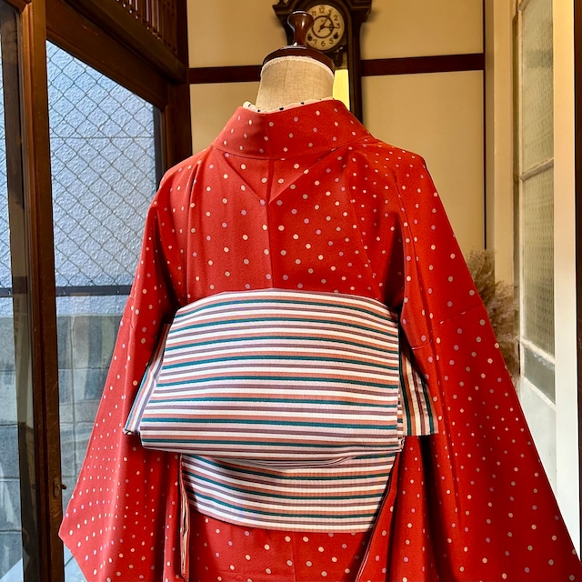 桃花色、梅鼠色、天鵞絨、白鼠など多彩な色合いの縞模様が美しい綴れ織の八寸名古屋帯です 色とりどりの縞模様はカジュアルで明るいカラーですが彩度は抑え、ポップ過ぎず、銀糸がほんのり上品な輝きを放っているので、幅広い年代の方にお使いいただけるかと思います✨ リボンを集めたようなカジュアルさで、プレゼント包装みたいですね♪ 銀座結びが、キャンディみたいにかわいく見えます♡ 様々な色で彩られているボーダー模様は色んな色柄のお着物に合わせやすく万能! 帯合わせに困った時の救世主になりそうです✨ 程よいハリ感のある、目の詰まった綴れ織なので、一度締めると緩みにくく扱いやすいです ○ 合わせた着物とオリジナル帯揚げスモークブルーとオリジナル三分紐ブルーグレー×ホワイトはweb shop掲載品です♪ その他は店主私物のため非売品となります。 ○掲載画像は、実際の色味に近づける努力を精一杯しておりますが、お使いの画面やブラウザによって写真と実物の色味が違って見える場合もございます。ご了承ください。 ◇仕立て◇ 八寸名古屋帯 ◇合わせる着物◇ 小紋や紬、色無地、木綿やデニム着物などのカジュアル着物に◎ ◇サイズ◇ 長さ 363cm 幅 30cm ◇素材◇ 正絹 ◇状態◇ 状態ランク 【リサイクル S】※ 特に、難など無く美品です✨️ +-+-+-+-+-+-+-+-+-+-+-+-+-+-+-+-+-+ ※ リサイクルS ・・・ 未使用、未使用同然の超美品✨ リサイクルA ・・・ わずかな使用感、または裏や着用すれば見えづらい所に少々の難などがありますが、着用には問題ない程度の美品✨ リサイクルB ・・・ 見える所にも少々の難などありますが、リサイクルに慣れた方でしたら着用には問題ない程度! リサイクルC・・・見える所にも大きめ又は多数、感じ方にも個人差のある難などがありますので、細かいことよりデザイン重視!の着物愛強めの方にオススメ! *状態の感じ方には個人差がありますので、リサイクルに馴染みの無い方、完璧をお求めの方は購入をお控え頂くとよいかと思います。 +-+-+-+-+-+-+-+-+-+-+-+-+-+-+-+-+-+ ◇ご注文の際の注意点◇ ○店舗でも同時に販売しているため、ご購入手続き、カード決済をしていただいても店舗では完売している場合がございます。 大変申し訳ございませんが、その際はご注文の取消と返金(カード会社へ決済キャンセル)させていただきますので、ご了承ください。 ○銀行振込みの方は5営業日以内、コンビニ振込みの方は5日以内にご入金がない場合は自動キャンセルとなりますのでご注意ください。 ○商品のお届けは、ご注文(入金確認)後、5日以内に発送いたします。 イベント出店前後など、すぐに発送できない場合もございますので、お急ぎで必要な方はご了承ください。 ○店舗受取りも可能です。 ご注文時、備考欄に『店舗受取り希望』とご記載ください。その際、送料分もお支払いいただいた方には、お店で送料分を返金いたしますのでお知らせください。 どうぞよろしくお願いいたします。