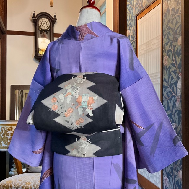 墨黒の細かい絽の生地に、淡い灰色の松皮菱模様と、童子の火消しの模様が愉快な、夏のアンティーク名古屋帯です 纏や提灯を持った江戸時代の消防団 "め組" が描かれた、洒落たデザインのめずらしい一本 お太鼓の部分には刺繍も施されています✨️ 黒地なので、ダーク系の着物や小物を合わせれば、クールな雰囲気のコーディネートにも仕上げられますね♥ シックな色合いのアンティークや現代物の夏着物や単衣、絞り浴衣にオススメです♩ 程よい柔らかさと薄さで締めやすそうです◎ ○合わせたアンティーク夏着物、オリジナル夏帯揚げライムグリーン×カシス、オリジナル三分紐リバーシブルライン プラム×ミントもwebshop掲載品です♪ その他は店主私物のため非売品。 ○掲載画像は、実際の色味に近づける努力を精一杯しておりますが、お使いの画面やブラウザによって写真と実物の色味が違って見える場合もございます。ご了承ください。 ◇サイズ◇ 長さ 388cm 幅 30cm ◇素材◇ 正絹 ◇合わせる着物◇ アンティークの夏の小紋や銘仙、夏お召、単衣着物 現代モノの夏着物、単衣着物、絞り浴衣 アンティークの夏の訪問着や付下げを カジュアルに着たい時 ◇状態◇ 状態ランク 【 アンティーク B 】 お太鼓にうっすらクスミ。 たれ左、たれの上、胴前の見えなくなる所に小穴。 その他は難など無く美品です! ( 難などの箇所を○で示していますので写真にてご確認ください ) *その他、表記にないアンティーク特有の染めムラや織ムラ、くすみなどが僅かに見られる場合があります。 +-+-+-+-+-+-+-+-+-+-+-+-+-+-+-+-+-+ 状態ランク アンティーク S ・・・ アンティークにしては目立つ難など無く超美品✨70〜100年近く前の時代のものとは思えない状態の良さ✨ アンティーク A ・・・ 裏や着用すれば見えづらい所に少々アンティーク特有の難などありますが、着用には問題ない程度!アンティークとしては美品と言えます✨ アンティーク B ・・・ 見える所にも少々アンティーク特有の難などありますが、アンティークに慣れた方でしたら着用には問題ない程度! アンティーク C ・・・ 見える所にも大きめ又は多数、アンティーク特有の難などありますので、細かいことよりデザイン重視!のアンティーク愛強めの方にオススメ! *状態の感じ方には個人差がありますので、アンティークに馴染みの無い方、完璧をお求めの方はご購入をお控え頂くとよいかと思います。 +-+-+-+-+-+-+-+-+-+-+-+-+-+-+-+-+-+ ◇ご注文の際の注意点◇ ○店舗でも同時に販売しているため、ご購入手続き、カード決済をしていただいても店舗では完売している場合がございます。 大変申し訳ございませんが、その際はご注文の取消と返金(カード会社へ決済キャンセル)させていただきますので、ご了承ください。 ○銀行振込みの方は5営業日以内、コンビニ振込みの方は5日以内にご入金がない場合は自動キャンセルとなりますのでご注意ください。 ○商品のお届けは、ご注文(入金確認)後、5日以内に発送いたします。 イベント出店前後など、すぐに発送できない場合もございますので、お急ぎで必要な方はご了承ください。 ○店舗受取りも可能です。 ご注文時、備考欄に『店舗受取り希望』とご記載ください。その際、送料分もお支払いいただいた方には、お店で送料分を返金いたしますのでお知らせください。 どうぞよろしくお願いいたします。