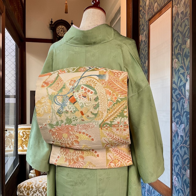 生成り地に、ラッパ、菊、唐花の織模様がお洒落なアンティーク丸帯です めずらしいラッパのような楽器や唐花の柄が東洋の雰囲気もあるお洒落なデザイン* グリーンやオレンジのやわらかい色合いの中に、金糸が織り込まれており、ほんのり煌めく色合いが素敵です✨️ アンティークの付下げや訪問着、色留袖、お振袖などにおすすめです♩ ○合わせたアンティーク着物はwebshop掲載品です♪ その他は店主私物のため非売品となります。 ○掲載画像は、実際の色味に近づける努力を精一杯しておりますが、お使いの画面やブラウザによって写真と実物の色味が違って見える場合もございます。ご了承ください。 ◇サイズ◇ 416cm 幅 30.3cm ◇素材◇ 正絹 ◇合わせる着物◇ アンティークの付下げや訪問着などの フォーマルな着物 ◇状態◇ 状態ランク 【 アンティーク A 】 胴前の片面に小シミ。 *その他、表記にないアンティーク特有の染めムラや織ムラ、くすみなどが僅かに見られる場合があります。 +-+-+-+-+-+-+-+-+-+-+-+-+-+-+-+-+-+ 状態ランク アンティーク S ・・・ アンティークにしては目立つ難など無く超美品✨70〜100年近く前の時代のものとは思えない状態の良さ✨ アンティーク A ・・・ 裏や着用すれば見えづらい所に少々アンティーク特有の難などありますが、着用には問題ない程度!アンティークとしては美品と言えます✨ アンティーク B ・・・ 見える所にも少々アンティーク特有の難などありますが、アンティークに慣れた方でしたら着用には問題ない程度! アンティーク C ・・・ 見える所にも大きめ又は多数、アンティーク特有の難などありますので、細かいことよりデザイン重視!のアンティーク愛強めの方にオススメ! *状態の感じ方には個人差がありますので、アンティークに馴染みの無い方、完璧をお求めの方はご購入をお控え頂くとよいかと思います。 +-+-+-+-+-+-+-+-+-+-+-+-+-+-+-+-+-+ ◇ご注文の際の注意点◇ ○店舗でも同時に販売しているため、ご購入手続き、カード決済をしていただいても店舗では完売している場合がございます。 大変申し訳ございませんが、その際はご注文の取消と返金(カード会社へ決済キャンセル)させていただきますので、ご了承ください。 ○銀行振込みの方は5営業日以内、コンビニ振込みの方は5日以内にご入金がない場合は自動キャンセルとなりますのでご注意ください。 ○商品のお届けは、ご注文(入金確認)後、5日以内に発送いたします。 イベント出店前後など、すぐに発送できない場合もございますので、お急ぎで必要な方はご了承ください。 ○店舗受取りも可能です。 ご注文時、備考欄に『店舗受取り希望』とご記載ください。その際、送料分もお支払いいただいた方には、お店で送料分を返金いたしますのでお知らせください。 どうぞよろしくお願いいたします。
