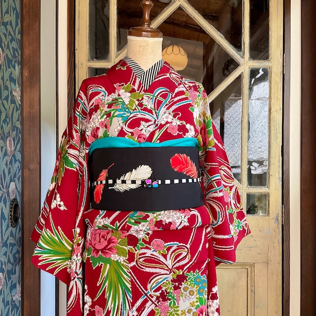 red bouquet*花薬玉 ラズベリーレッド 赤 牡丹 芍薬 椿 アンティーク小紋着物 B288