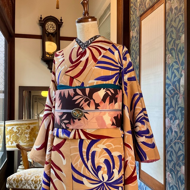 Deco spraymums*オレンジベージュ 乱菊 スプレー菊 アンティーク小紋着物 B290