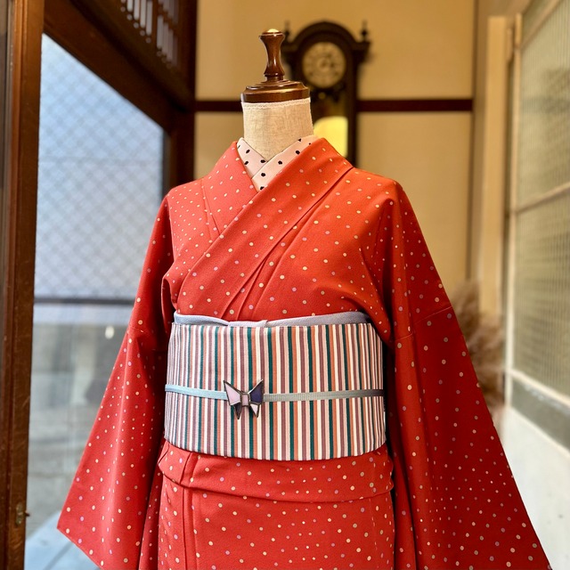 落ち着いたレッド、茜色の地色に、ドット模様がデザインされた小紋着物です レッド×ドットの組み合わせ、とても大人カワイイ♡ 地色のレッドは、深くブラウン交じりのくすみレッド、ドットの色味はやさしいパステルカラーでブルーグレー、イエロー、グリーンでカラフルポップさがいいですね♪ また大小のドットが規則的に曲線を描き、デザインがとても遊びゴコロがあって、シンプルながらも個性あふれる一枚✨ レトロワンピースのように、洋服感覚でのコーディネートもオススメです! プレゼントの包装紙のように大人カワイイ柄なので、バレンタインやクリスマスの時期にプレゼントをイメージしたコーディネートに着ても素敵です♡ こちらは身丈も長いため、トールサイズでお探しの方はぜひどうぞ ○合わせた帯とオリジナル帯揚げスモークブルー、オリジナル三分紐ブルーグレー×ホワイトはweb shop掲載品です♪ その他は店主私物のため非売品となります ○掲載画像は、実際の色味に近づける努力を精一杯しておりますが、お使いの画面やブラウザによって写真と実物の色味が違って見える場合もございます。ご了承ください。 ◇仕立て◇ 袷着物 広衿 ◇着用時期◇ 10月頃〜5月頃 ◇サイズ◇ 裄 71cm 身丈(肩から) 167.5cm 袖丈51cm 前幅 24.5cm 後幅 30.5cm ◇適応身長◇ 162cm~172cmくらいまでの方に特にオススメです♪ *tentoでは、 身丈160cm以上165cmまでをlong 身丈165.5cm以上をtallと記載しております ⭐︎標準体型の方でしたら、身長より身丈が7センチほど短くてもおはしょり取れることが多いです。 それ以上短い場合は、おはしょりナシで着る対丈や、ブーツやスカートなどを合わせて洋服ミックスコーデなど工夫すれば着られます♪ 長い分には、身長より身丈が10センチ長いくらいまでは腰紐の位置を上げるなどして調整可能です。 *適応身長について詳しくはこちらをどうぞ♪ ☟☟☟ https://ameblo.jp/kimonoyatento/entry-12254617641.html ◇素材◇ 表裏ともに正絹 ◇状態◇ 状態ランク【 リサイクル S 】 未使用品 しつけ糸あり 特に難など無く美品です✨ +-+-+-+-+-+-+-+-+-+-+-+-+-+-+-+-+-+ 状態ランク リサイクル S ・・・ 未使用、未使用同然の超美品✨ リサイクル A ・・・ わずかな使用感、または裏や着用すれば見えづらい所に少々の難などがありますが、着用には問題ない程度の美品✨ リサイクル B ・・・ 見える所にも少々の難などありますが、リサイクルに慣れた方でしたら着用には問題ない程度! リサイクル C・・・見える所にも大きめ又は多数、感じ方にも個人差のある難などがありますので、細かいことよりデザイン重視!の着物愛強めの方にオススメ! *状態の感じ方には個人差がありますので、リサイクルに馴染みの無い方、完璧をお求めの方は購入をお控え頂くとよいかと思います。 +-+-+-+-+-+-+-+-+-+-+-+-+-+-+-+-+-+ ◇ご注文の際の注意点◇ ○店舗でも同時に販売しているため、ご購入手続き、カード決済をしていただいても店舗では完売している場合がございます。 大変申し訳ございませんが、その際はご注文の取消と返金(カード会社へ決済キャンセル)させていただきますので、ご了承ください。 ○銀行振込みの方は5営業日以内、コンビニ振込みの方は5日以内にご入金がない場合は自動キャンセルとなりますのでご注意ください。 ○商品のお届けは、ご注文(入金確認)後、5日以内に発送いたします。 イベント出店前後など、すぐに発送できない場合もございますので、お急ぎで必要な方はご了承ください。 ○店舗受取りも可能です。 ご注文時、備考欄に『店舗受取り希望』とご記載ください。その際、送料分もお支払いいただいた方には、お店で送料分を返金いたしますのでお知らせください。 どうぞよろしくお願いいたします。
