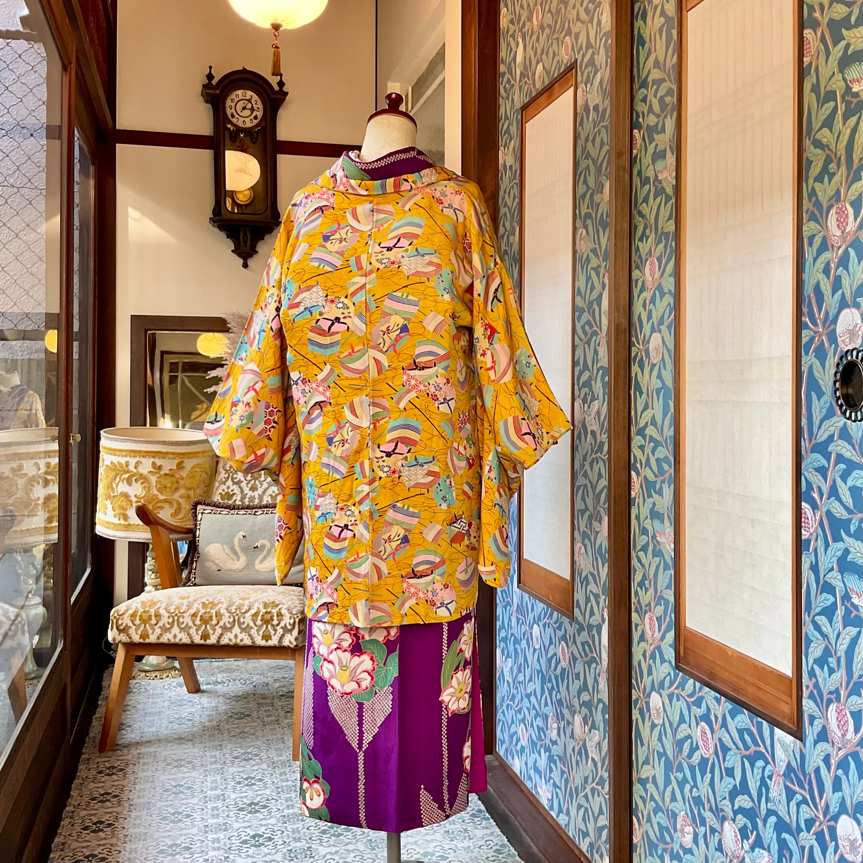 Wind the bobbin up*山吹色 糸巻き イエロー 錦紗縮緬 芥子 辛子 黄色 アンティーク羽織 A970
