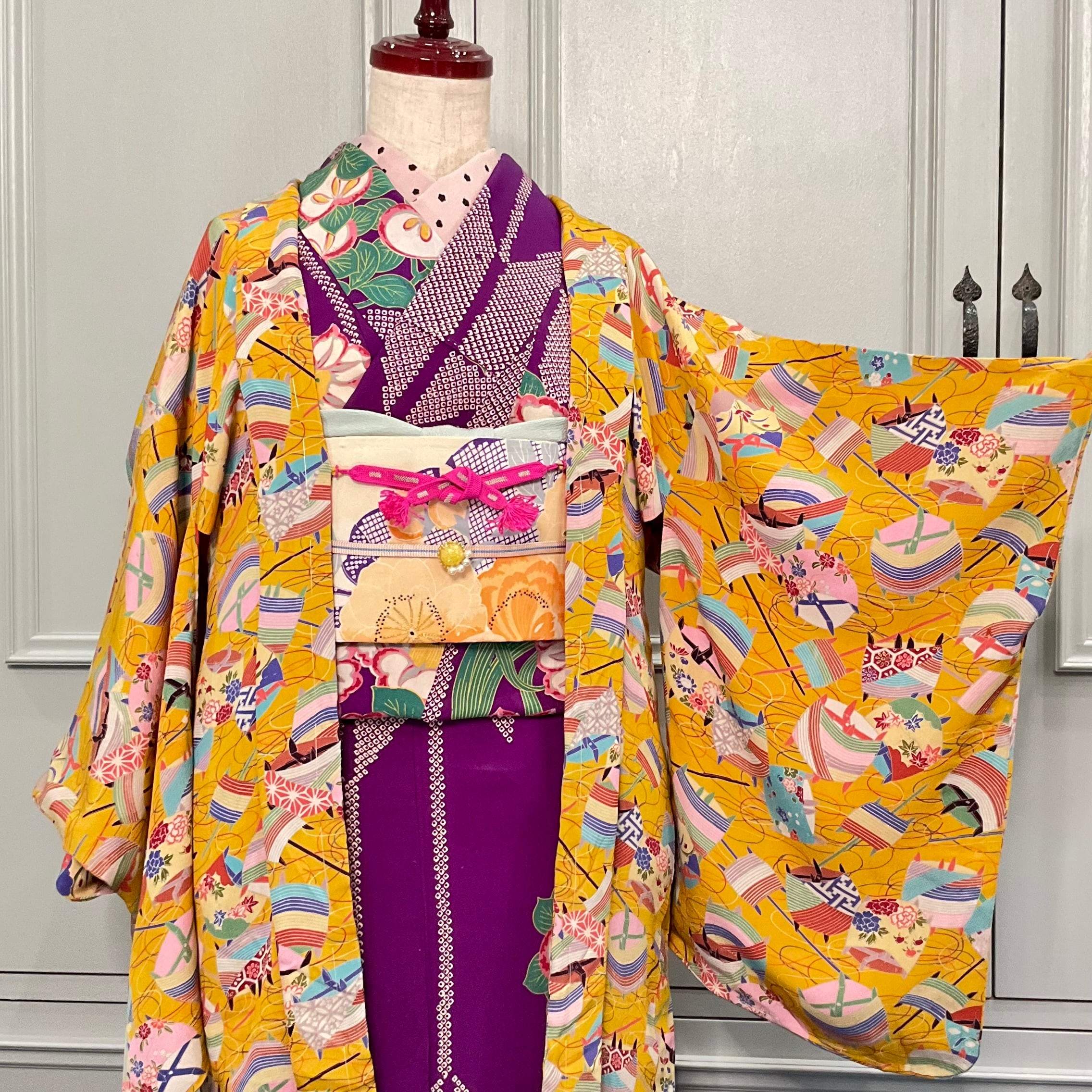 山吹の花の様なイエロー系の地色に、カラフルな糸巻きが描かれた錦紗縮緬地のアンティーク羽織です