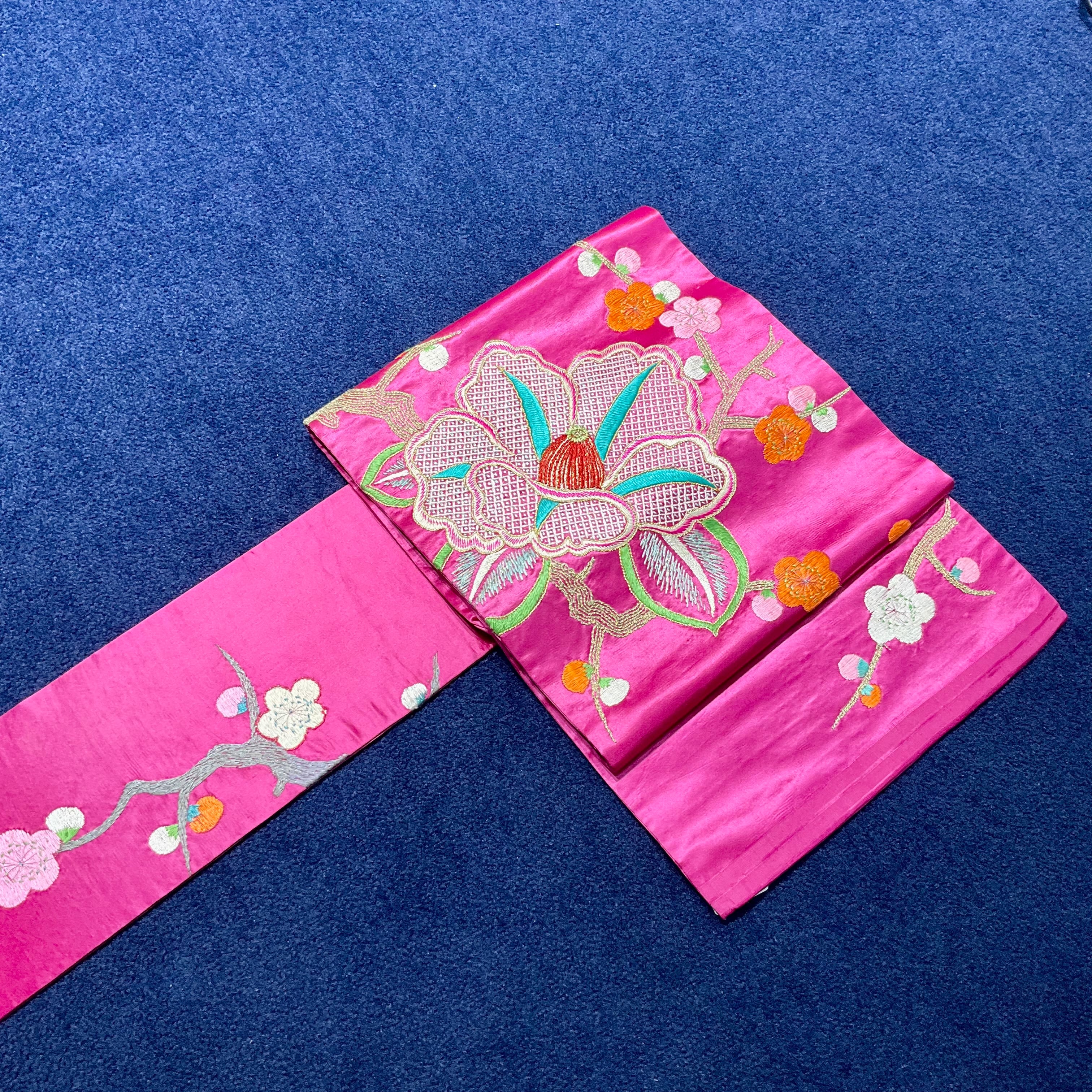 ビビットなピンクの繻子地に、椿と梅が刺繍されたアンティーク名古屋帯です