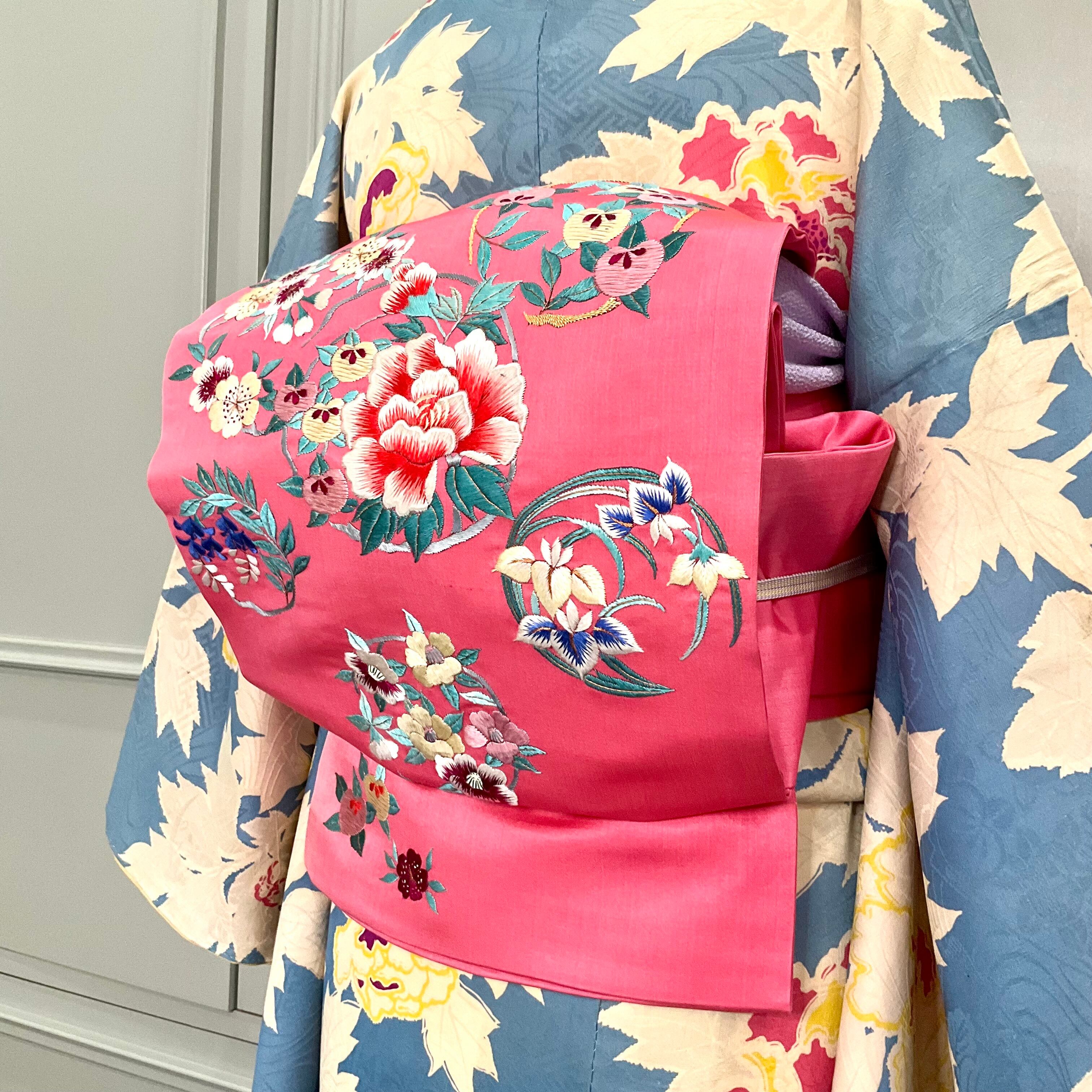 桃色の繻子地に、花丸紋が刺繍されたアンティーク名古屋帯です