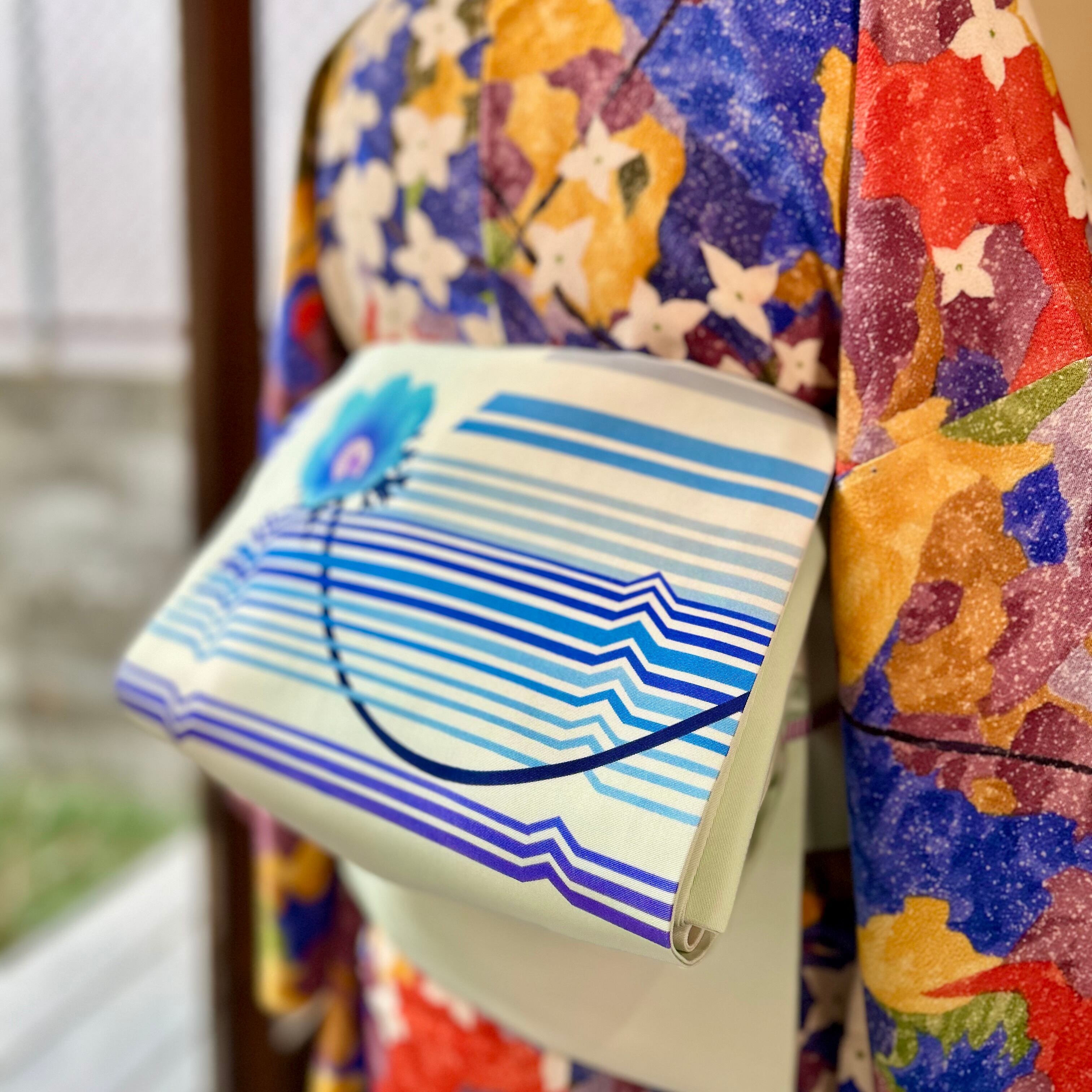 大胆にデザインされたアネモネは、縞模様に映え、塩瀬のサラリとした帯地が華やいでいます✨️