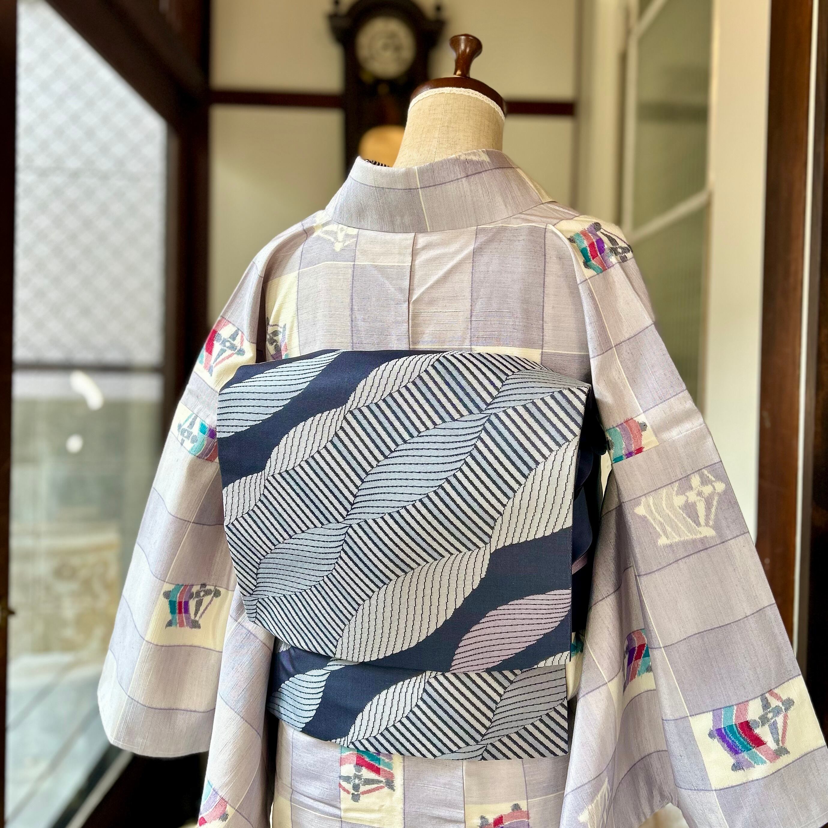 カジュアルな幾何学模様は、淡いブルーやラベンダーで彩られ、曲線で描かれた模様と斜めにデザインされたスタイリッシュさが洒落た帯です