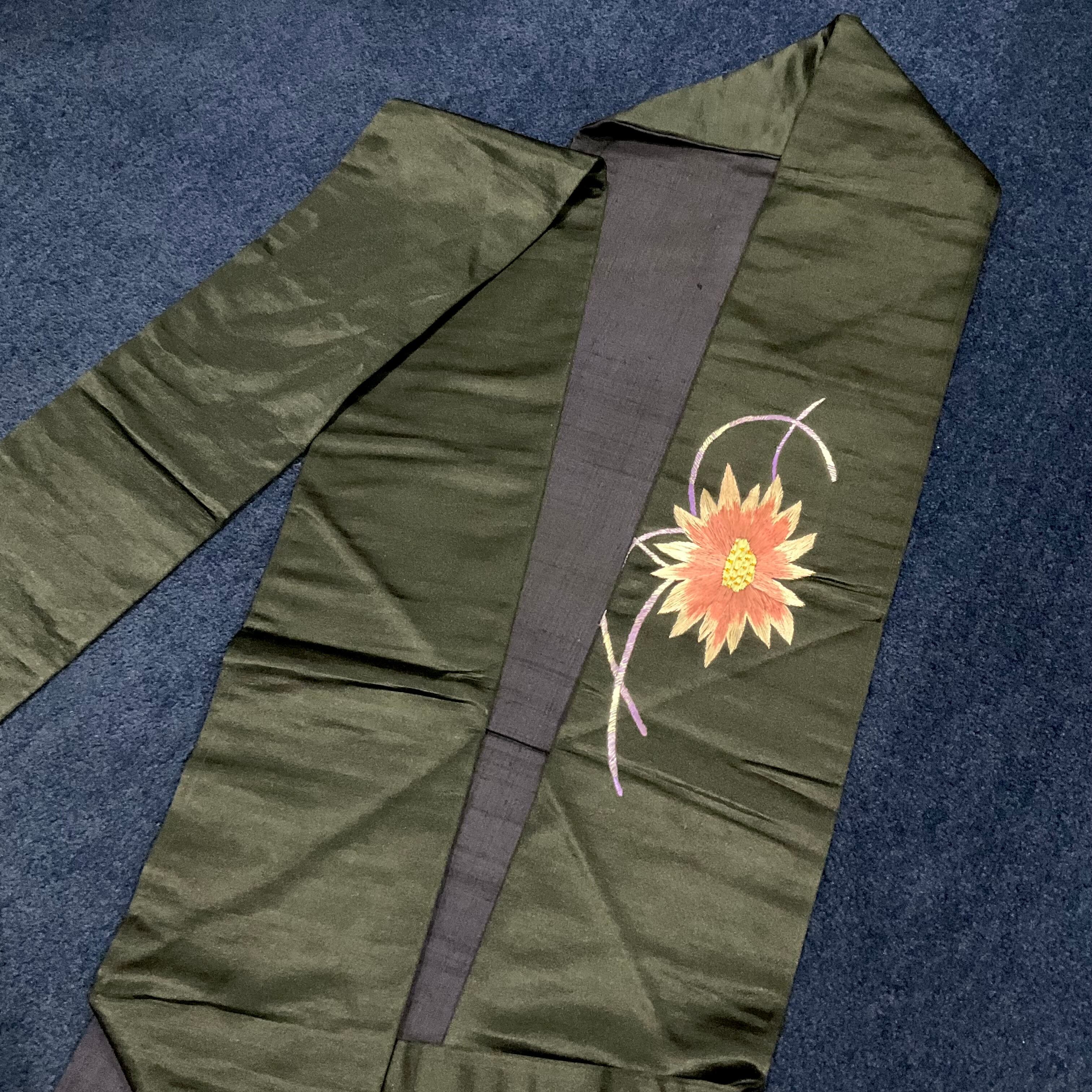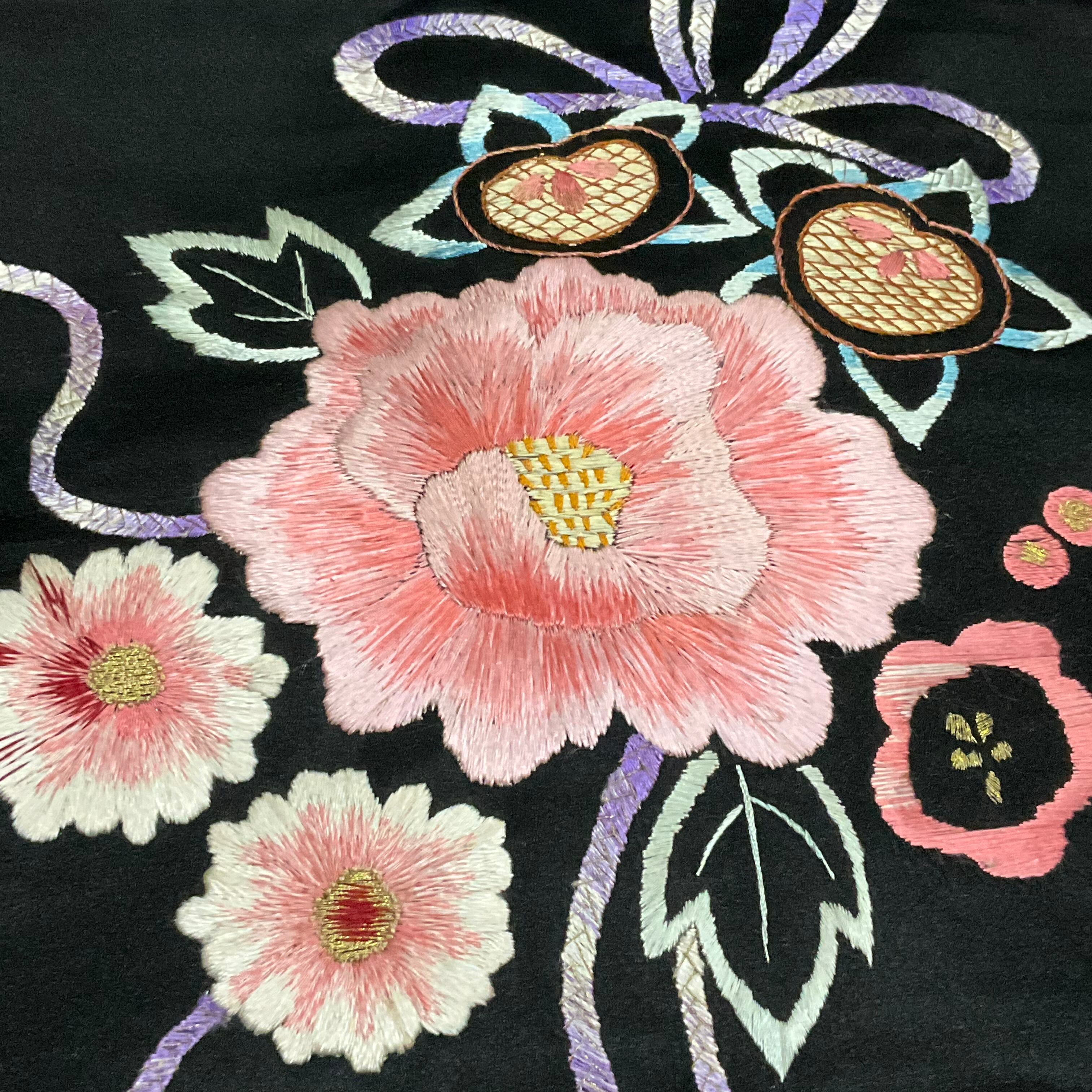 黒地にやさしいピンク系の牡丹や菊、梅、橘の刺繍が華やかな一本✨