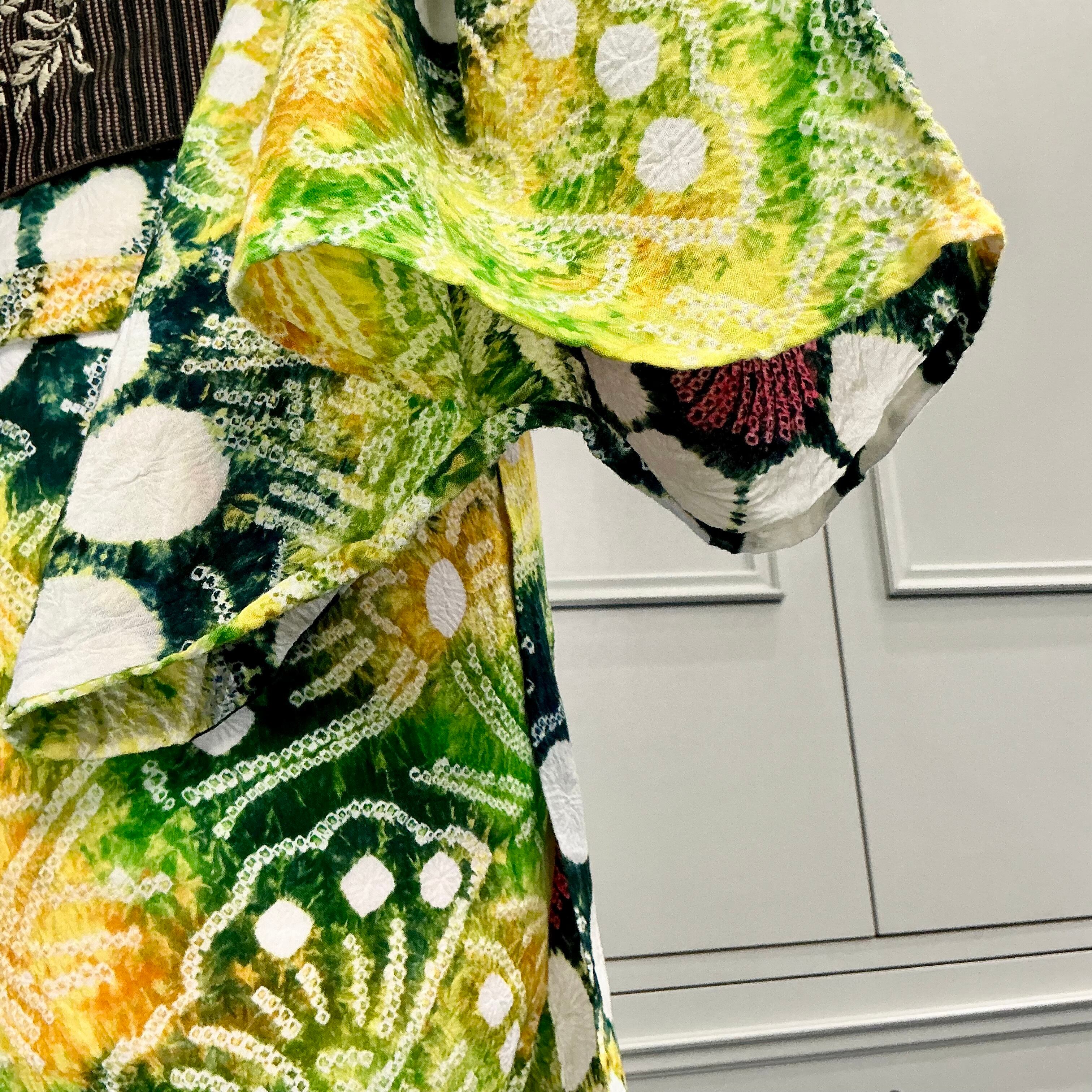 ひまわりと蝶々*花 イエロー グリーン 黄 緑 有松鳴海絞り浴衣 B025