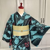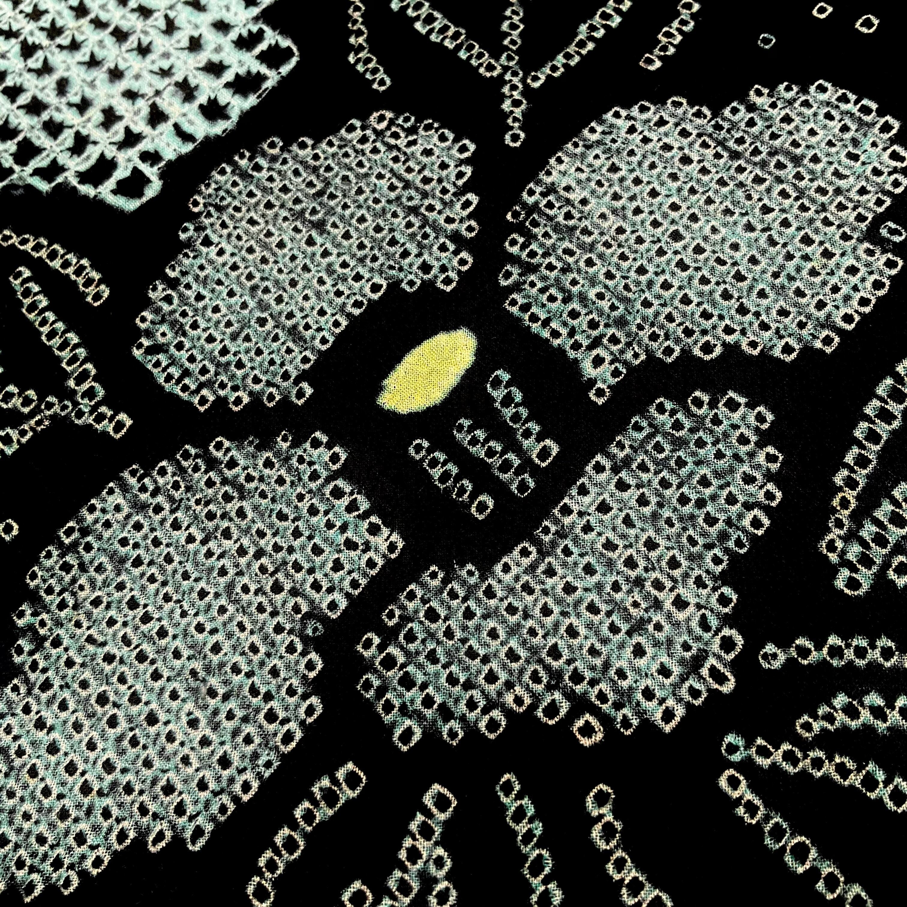 ブラックの地色に、ミントの爽やかな椿のモチーフが美しい有松鳴海絞り浴衣です