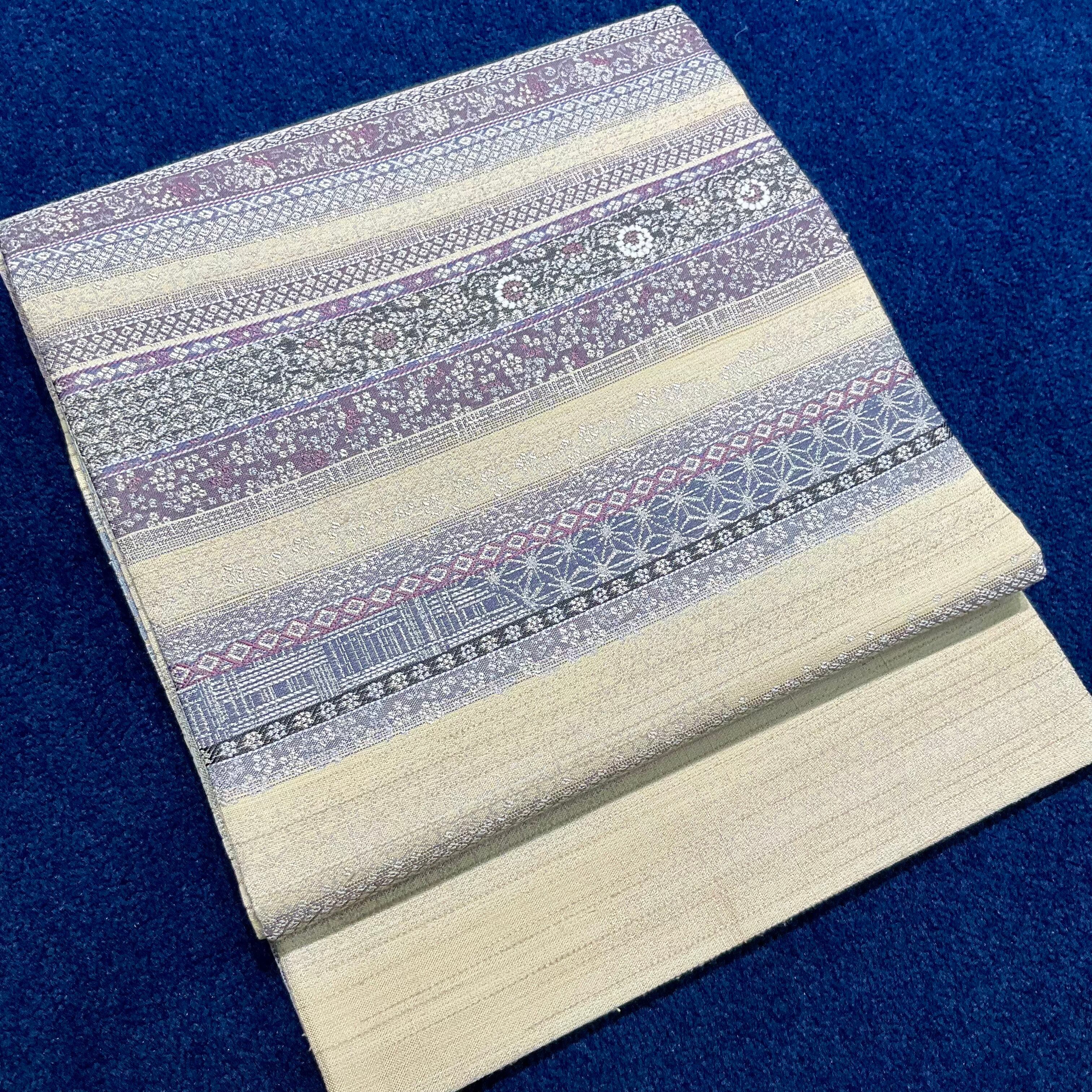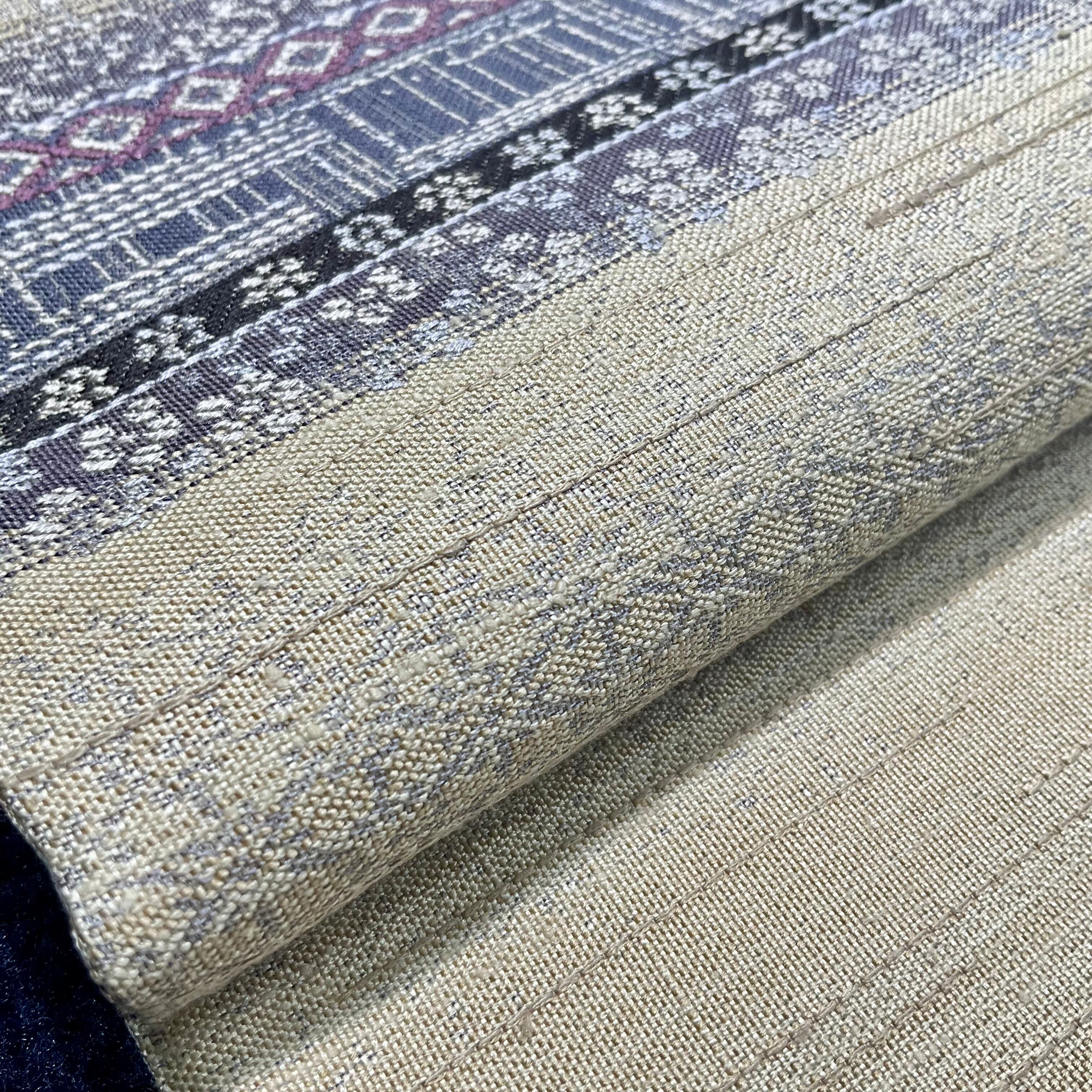 エルクベージュの地色に細やかな幾何学や花模様がモダンに織り出された京袋帯です