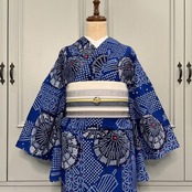 ブルー地に、番傘や麻の葉の模様が絞りで描かれた有松鳴海絞り浴衣です