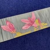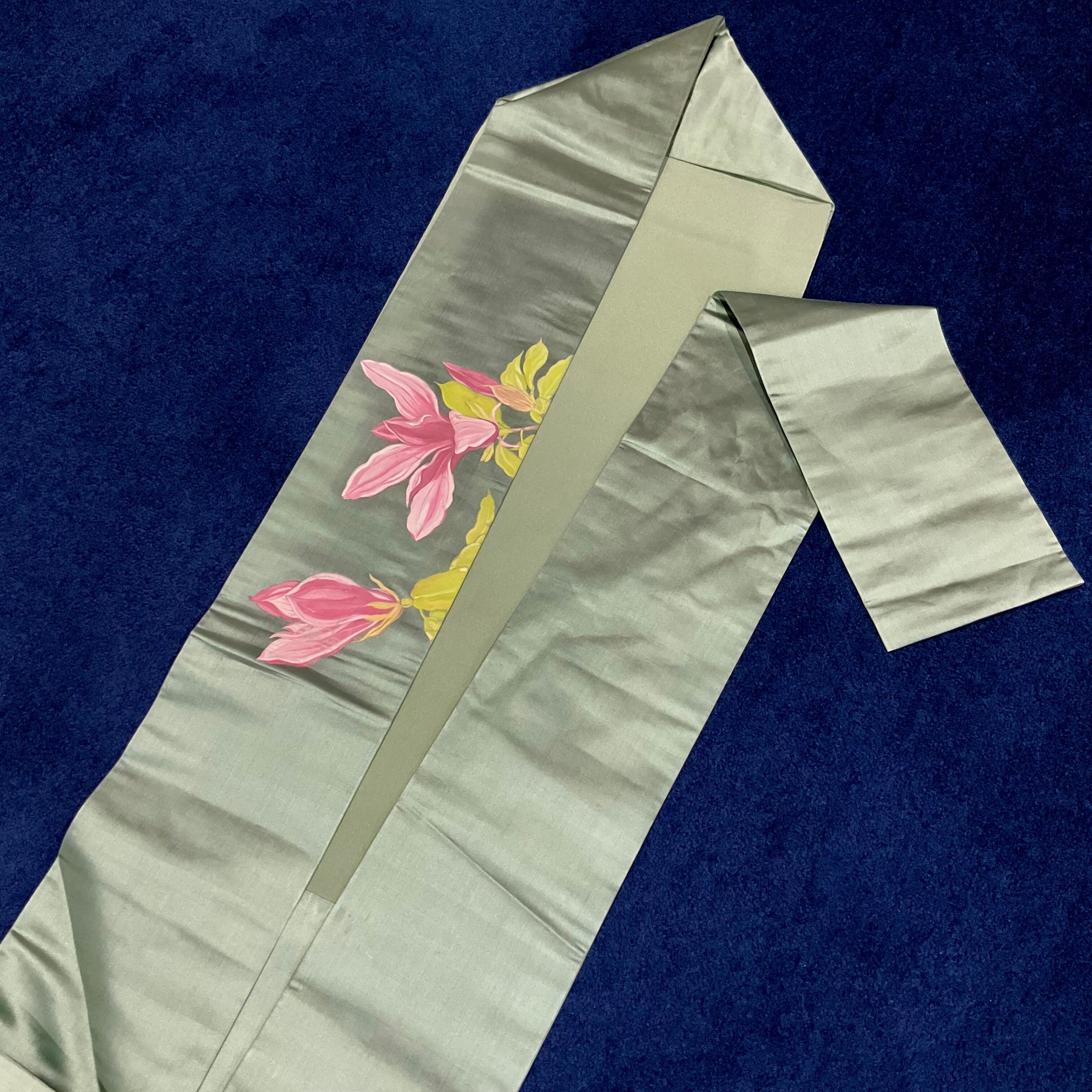 くすみグリーンの繻子地に、木蓮のお花が丁寧にペイントされたアンティーク名古屋帯です
