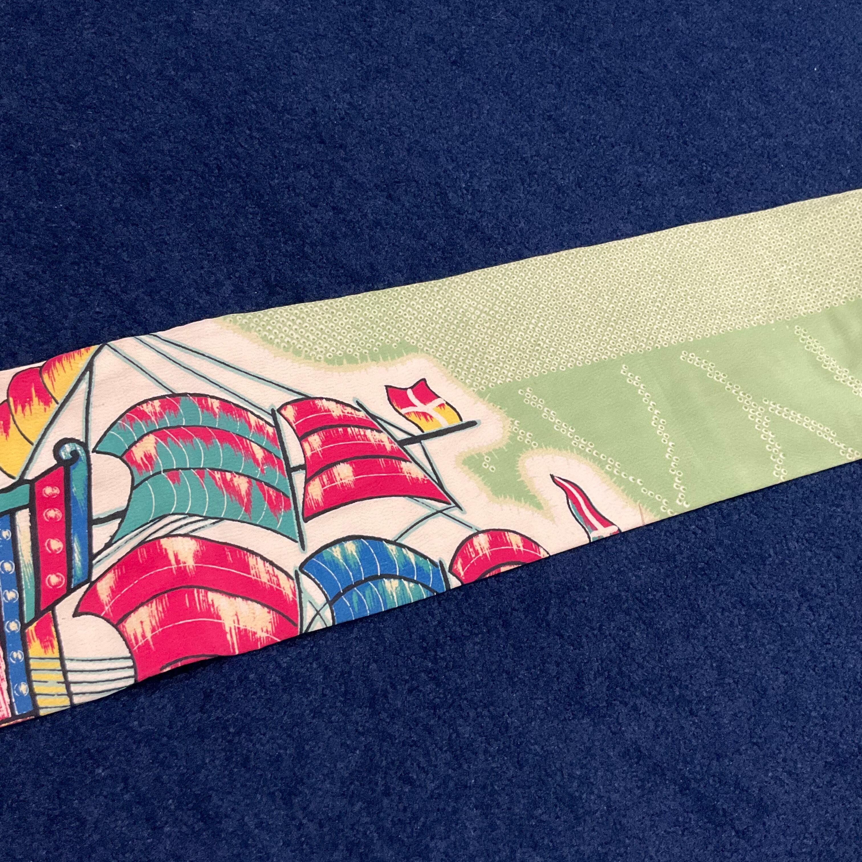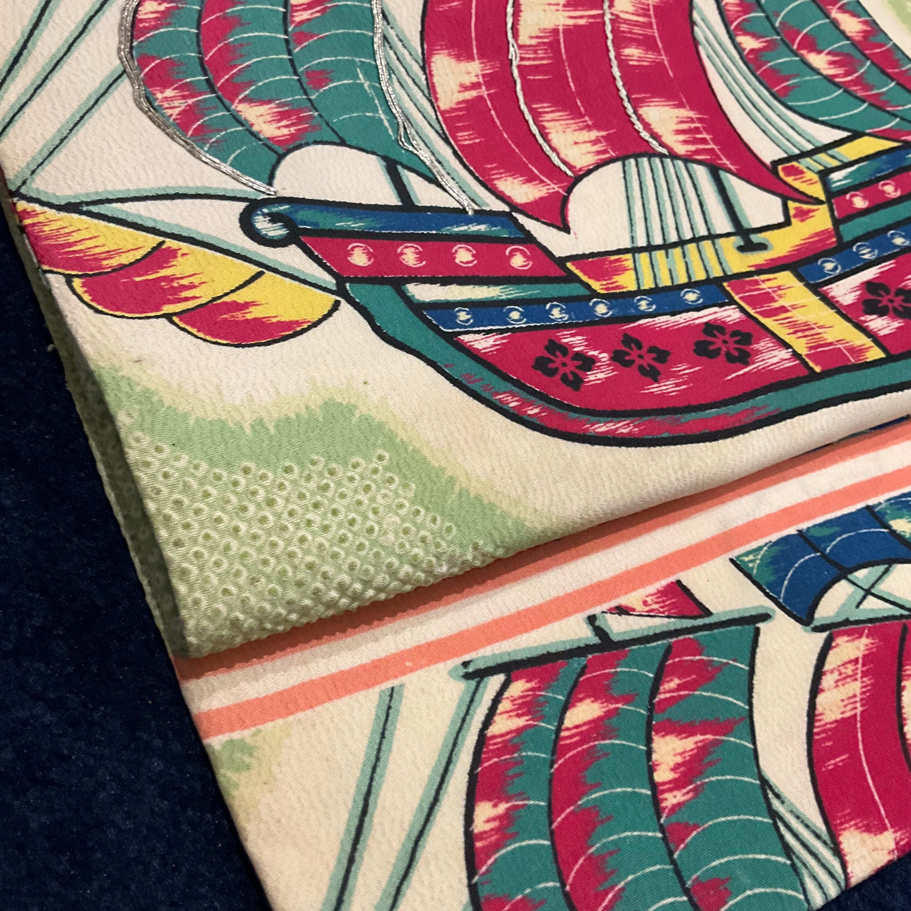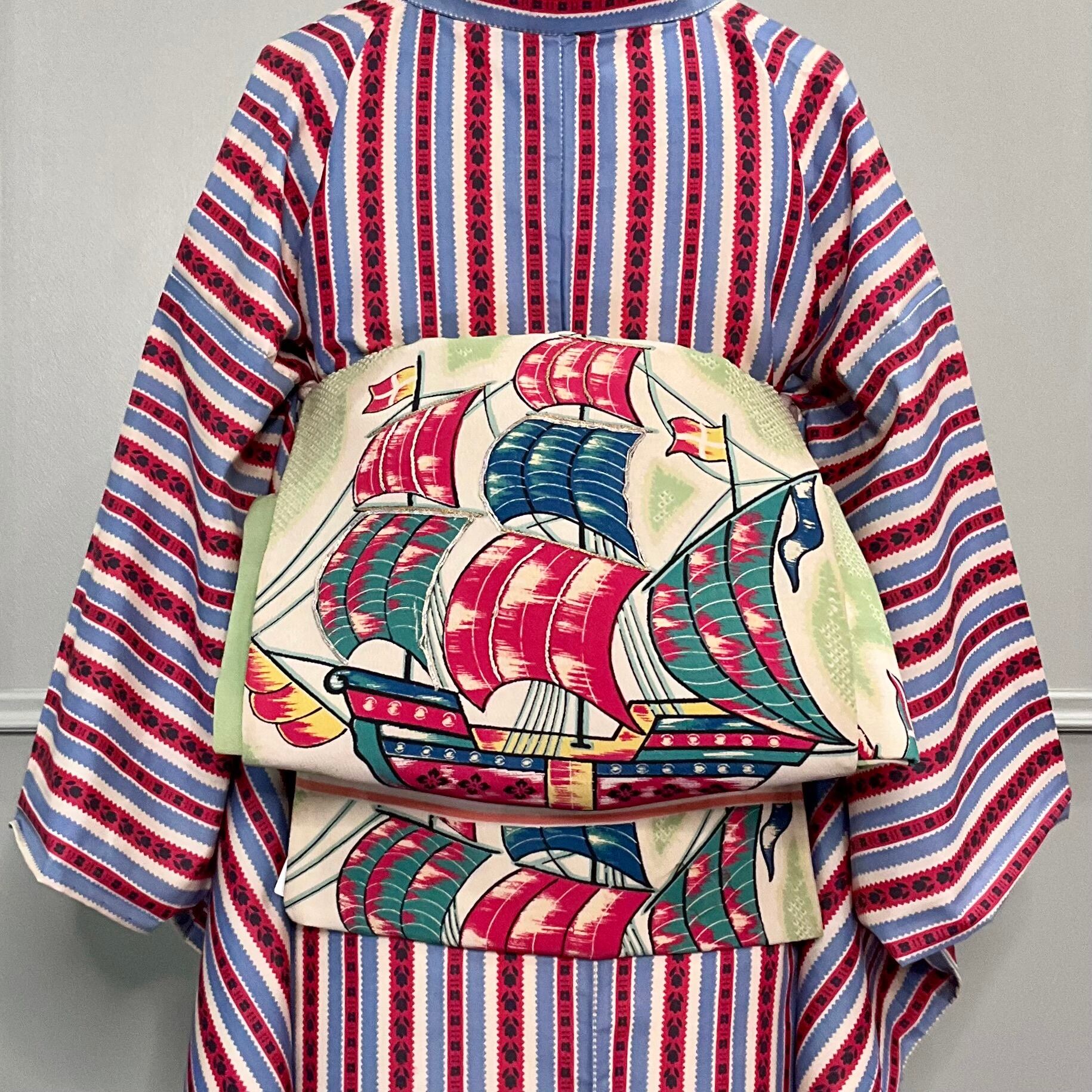 薄いミントグリーン地に、帆船の染め模様が美しいアンティーク名古屋帯です