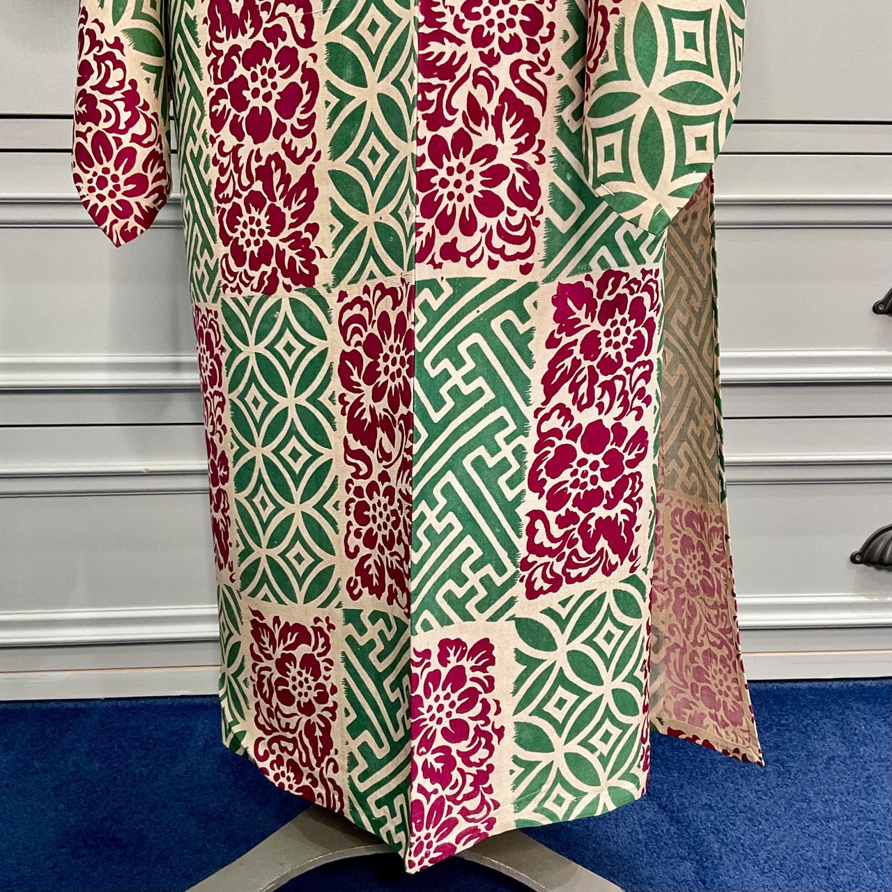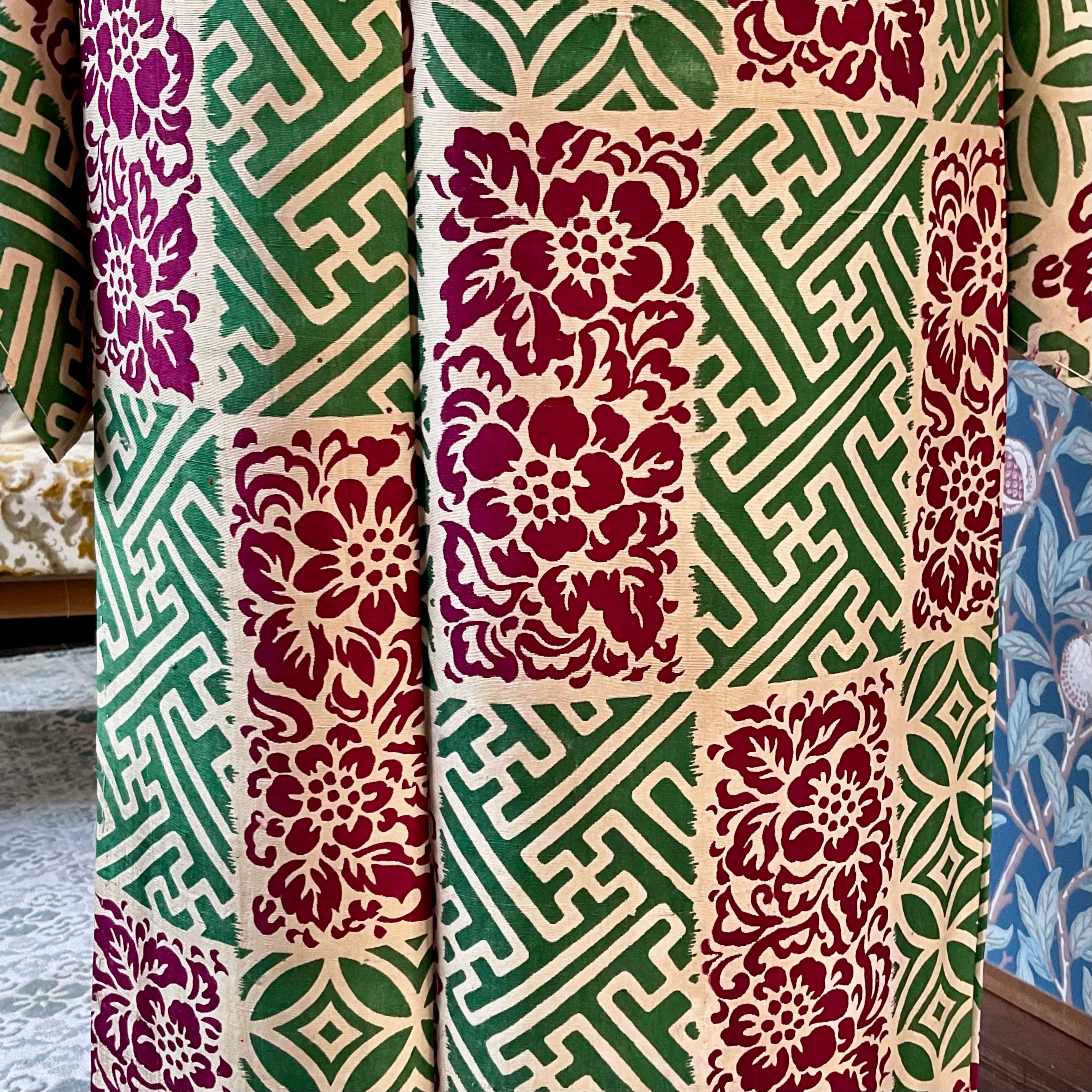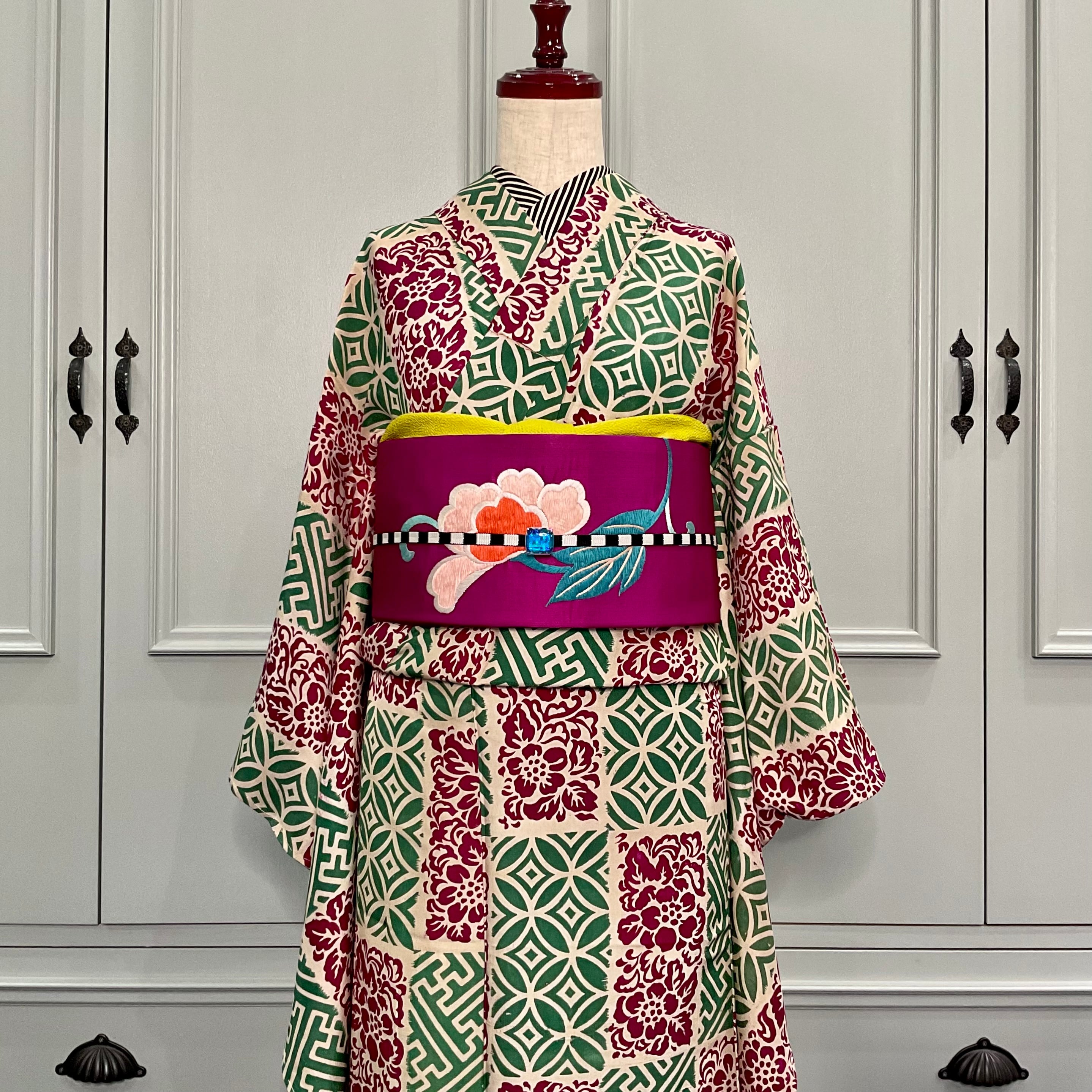 Auspicious*単衣 紗綾形 七宝 吉祥文様 市松模様 花 グリーン プラム パープル エンジ 臙脂 赤紫 銘仙 アンティーク銘仙着物 B088