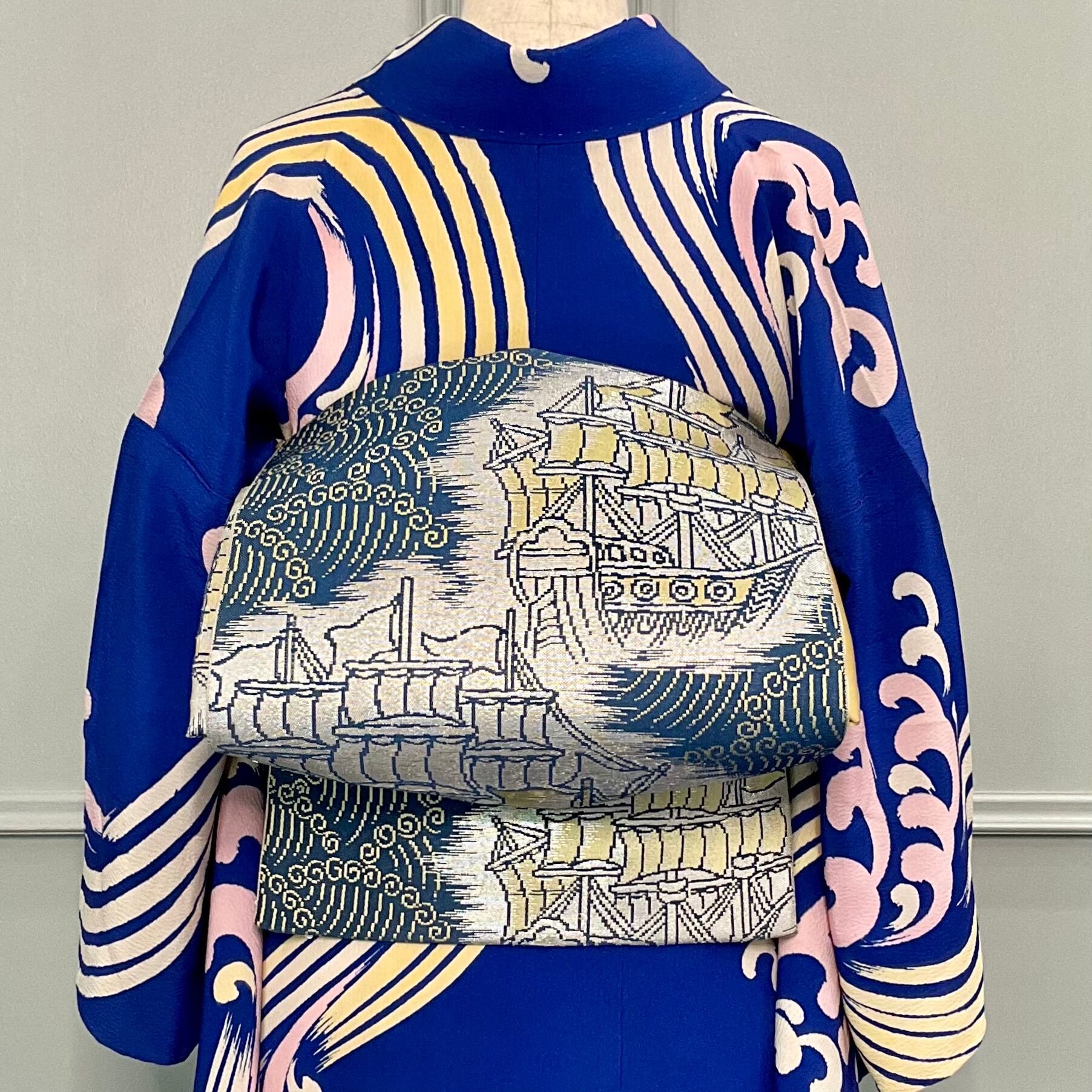 くすみブルー×シルバー地に、帆船の模様がお洒落なアンティーク名古屋帯です