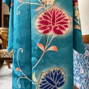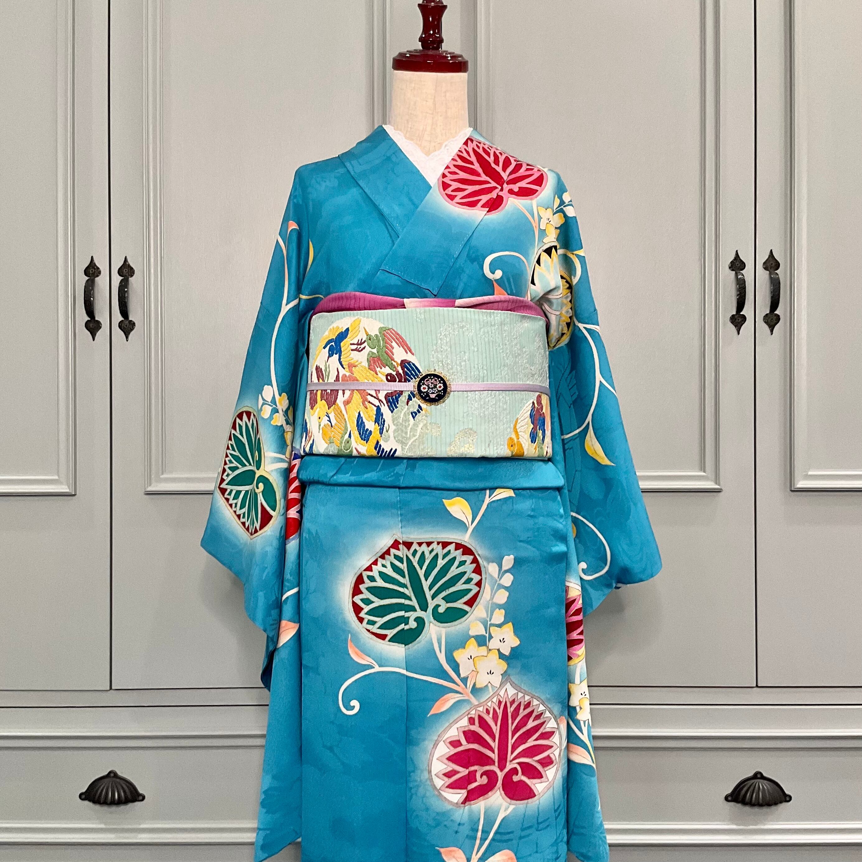 ターコイズブルー地に、葵が描かれた単衣仕立てのアンティーク訪問着です