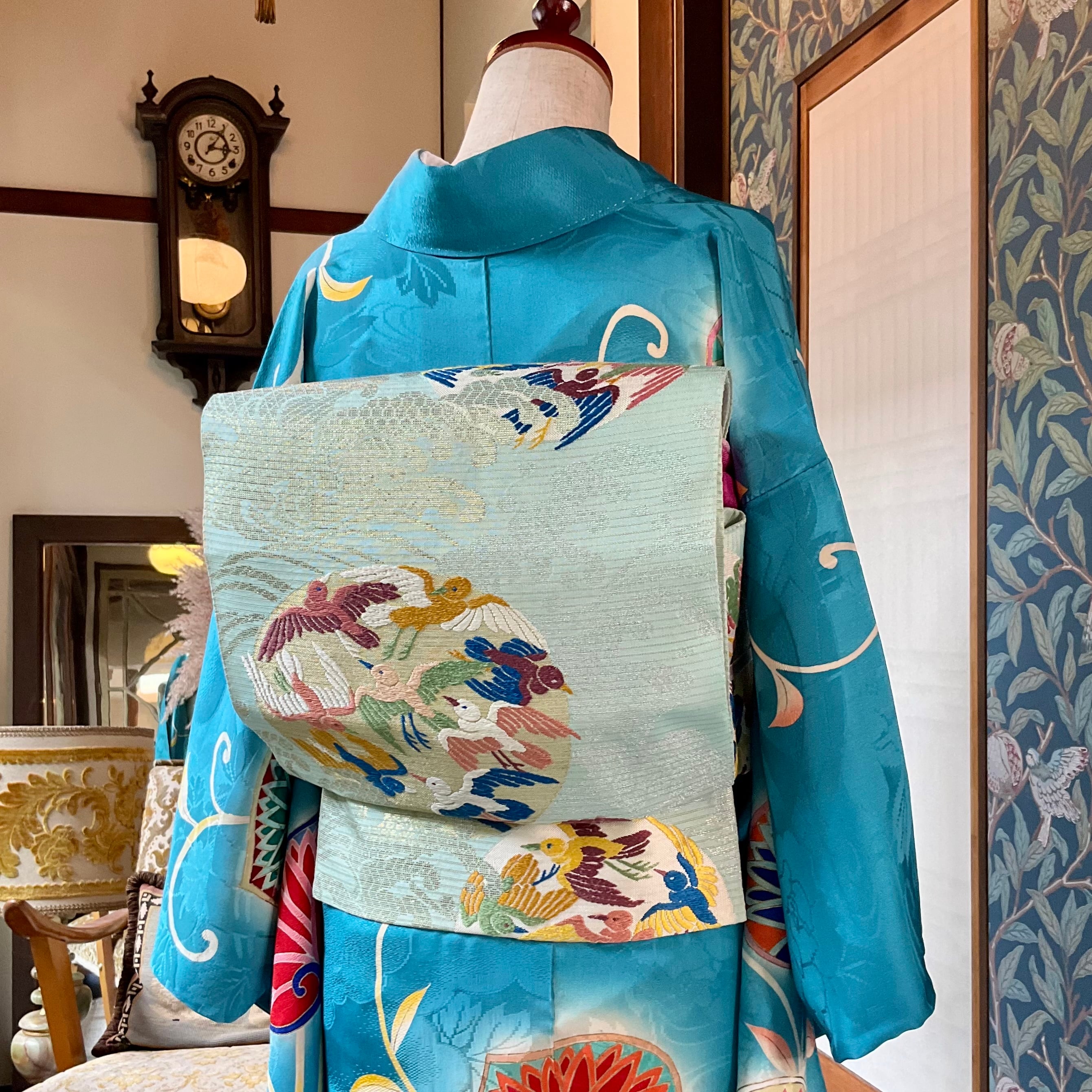 爽やかな水色地に、グリーン、レッド、ブルーの葵が全体に描かれ、豪華な柄行きです*