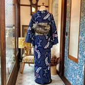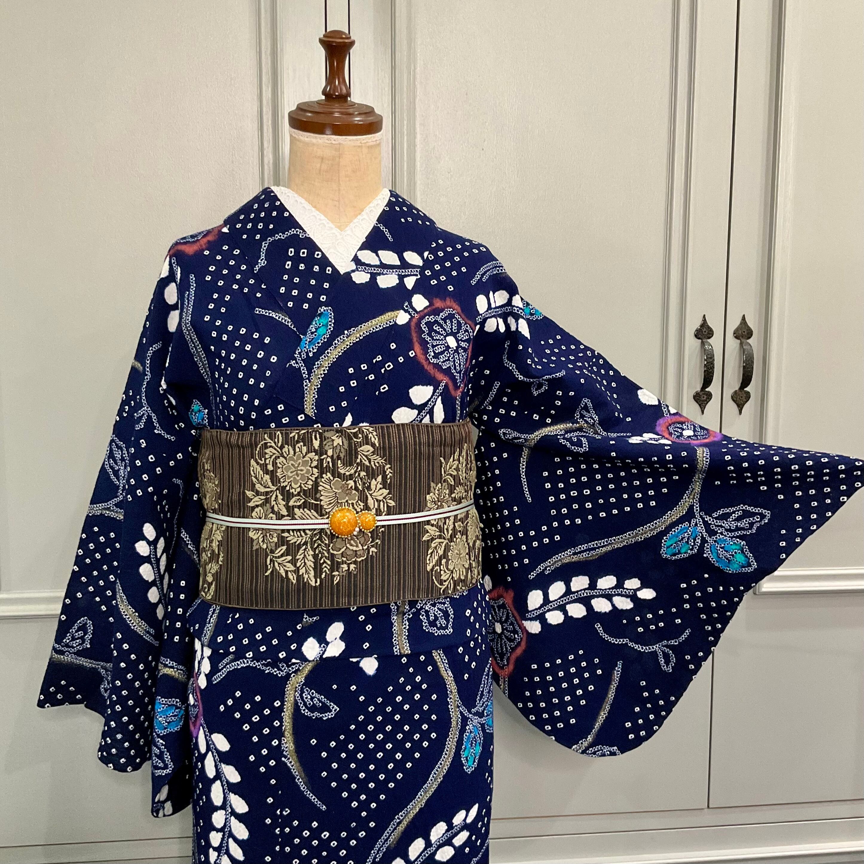 濃紺地に、色鮮やかに辻が花を連想させる花模様が美しい有松鳴海絞り浴衣です