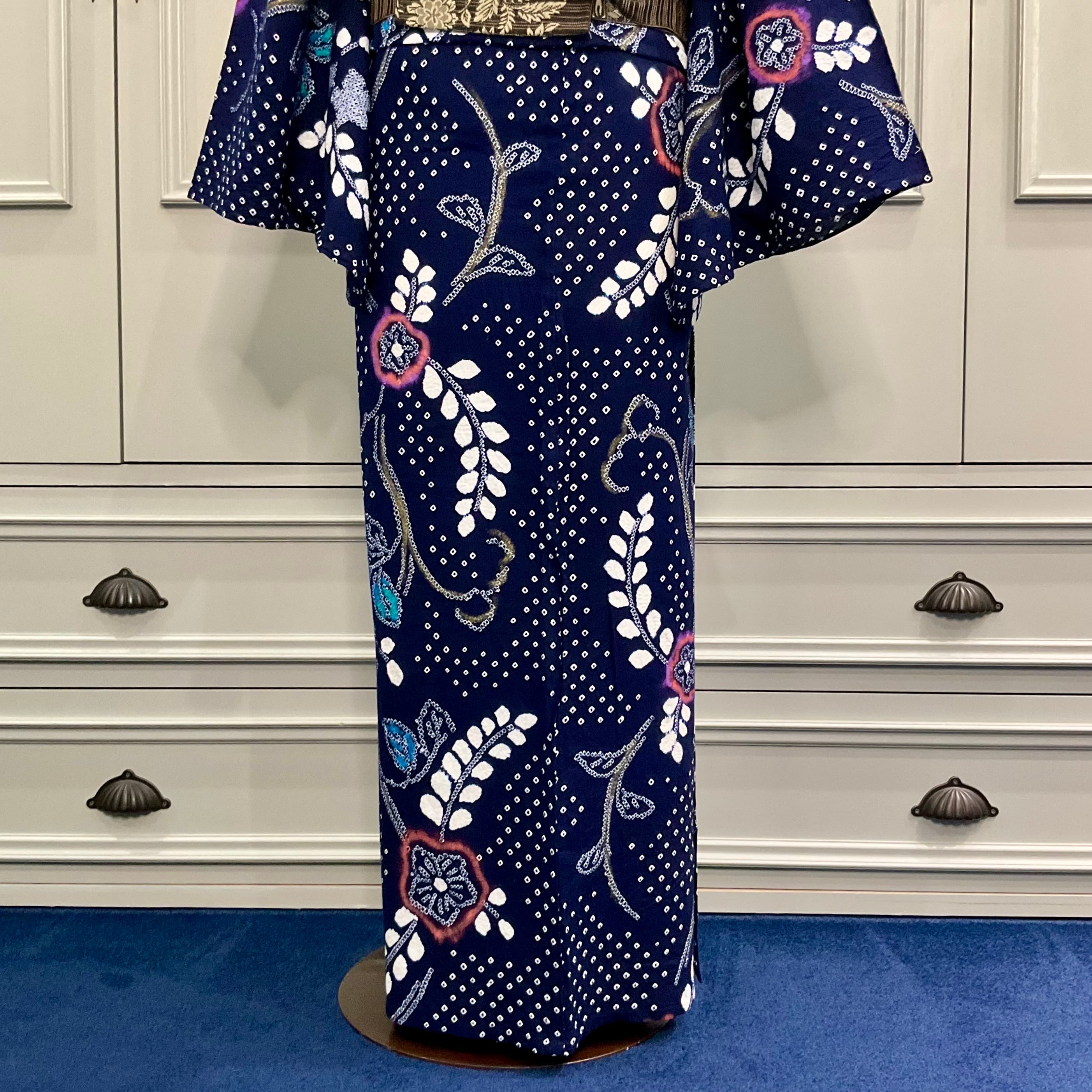 濃紺の地に映えるターコイズやオレンジ、パープルのビビットカラーの花模様にゴールドのラメがアクセント!