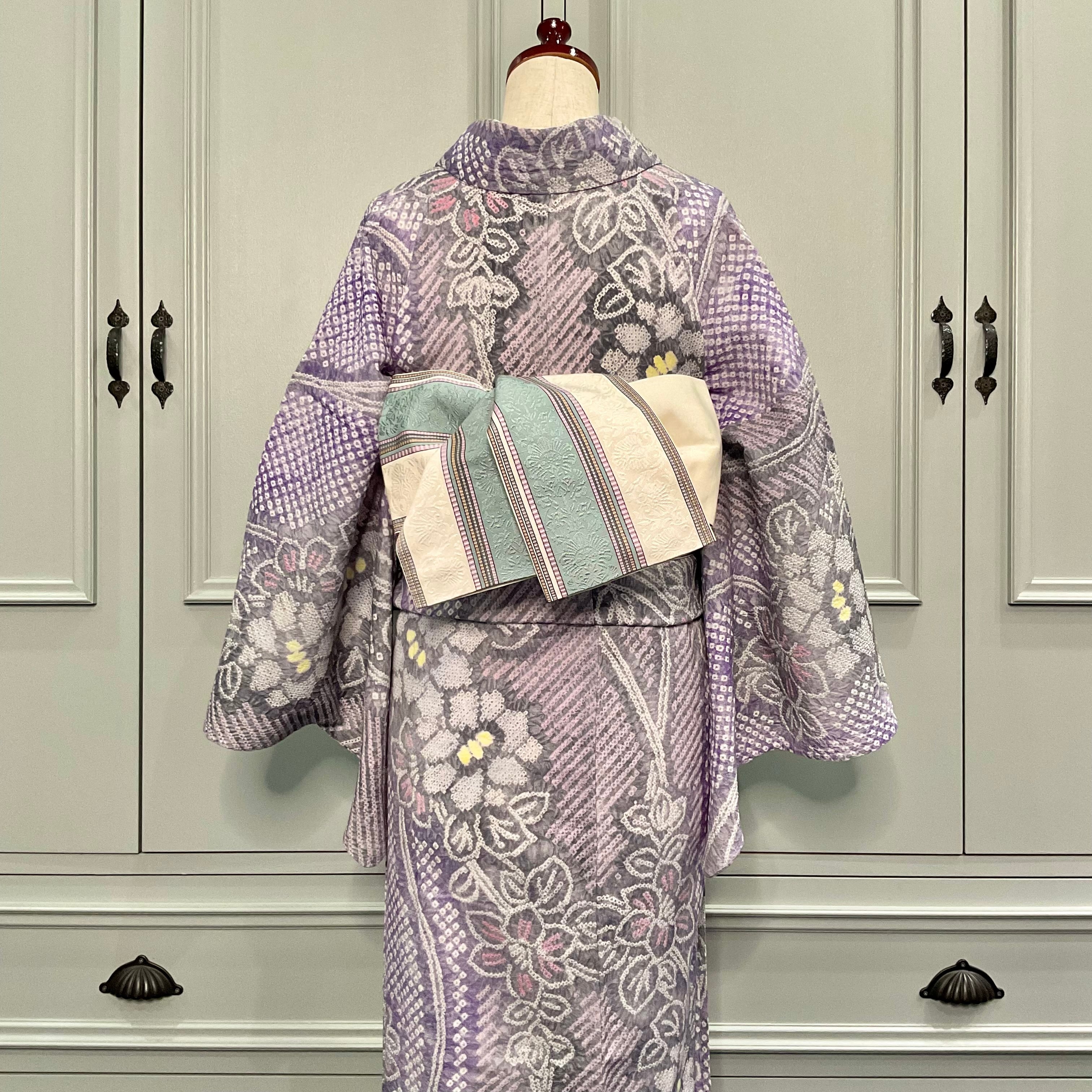 やさしいパープル×グレー地に、お花と揺らいだラインがきれいな有松鳴海絞り浴衣です