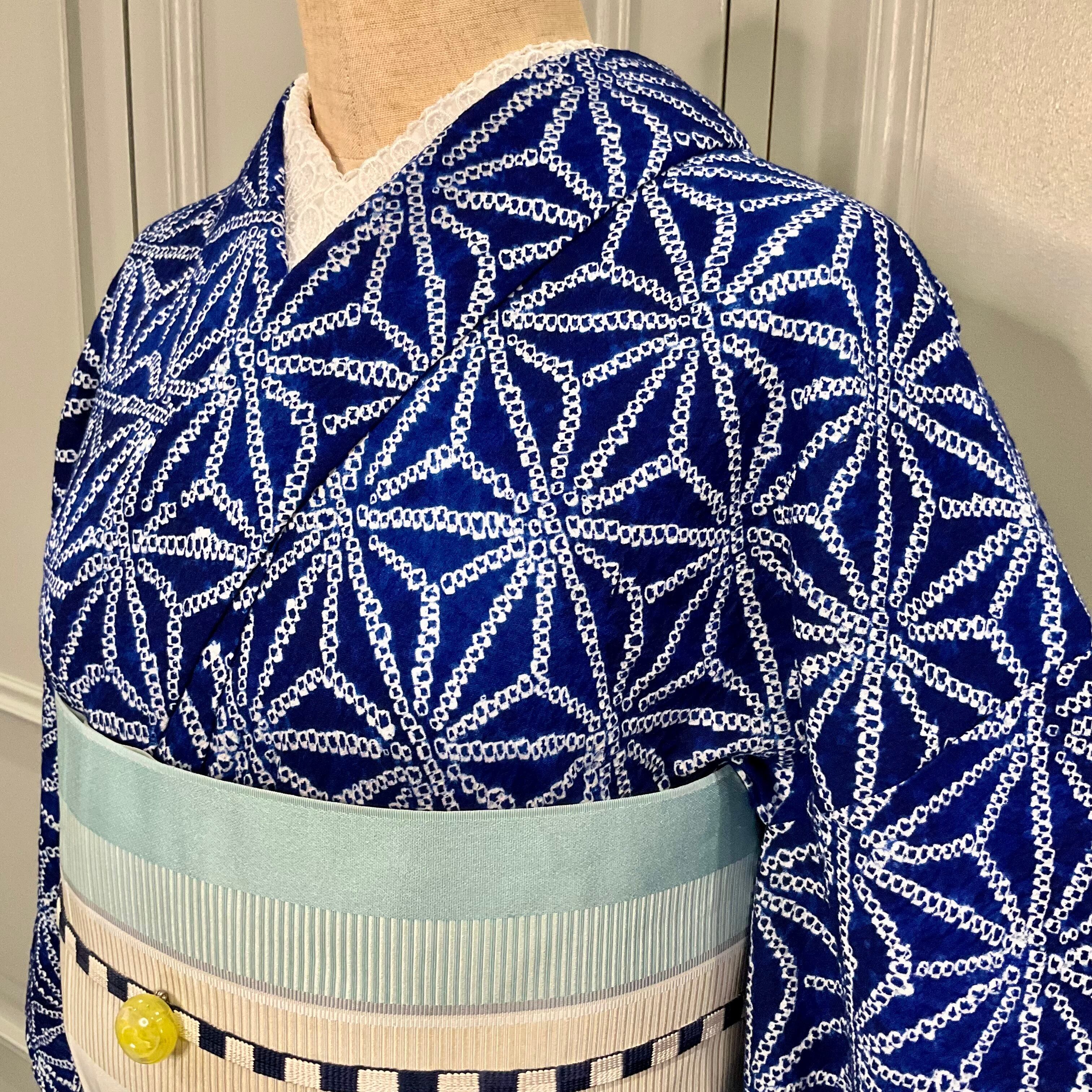 ネイビーブルー地に、麻の葉つなぎが目を惹く有松鳴海絞り浴衣です