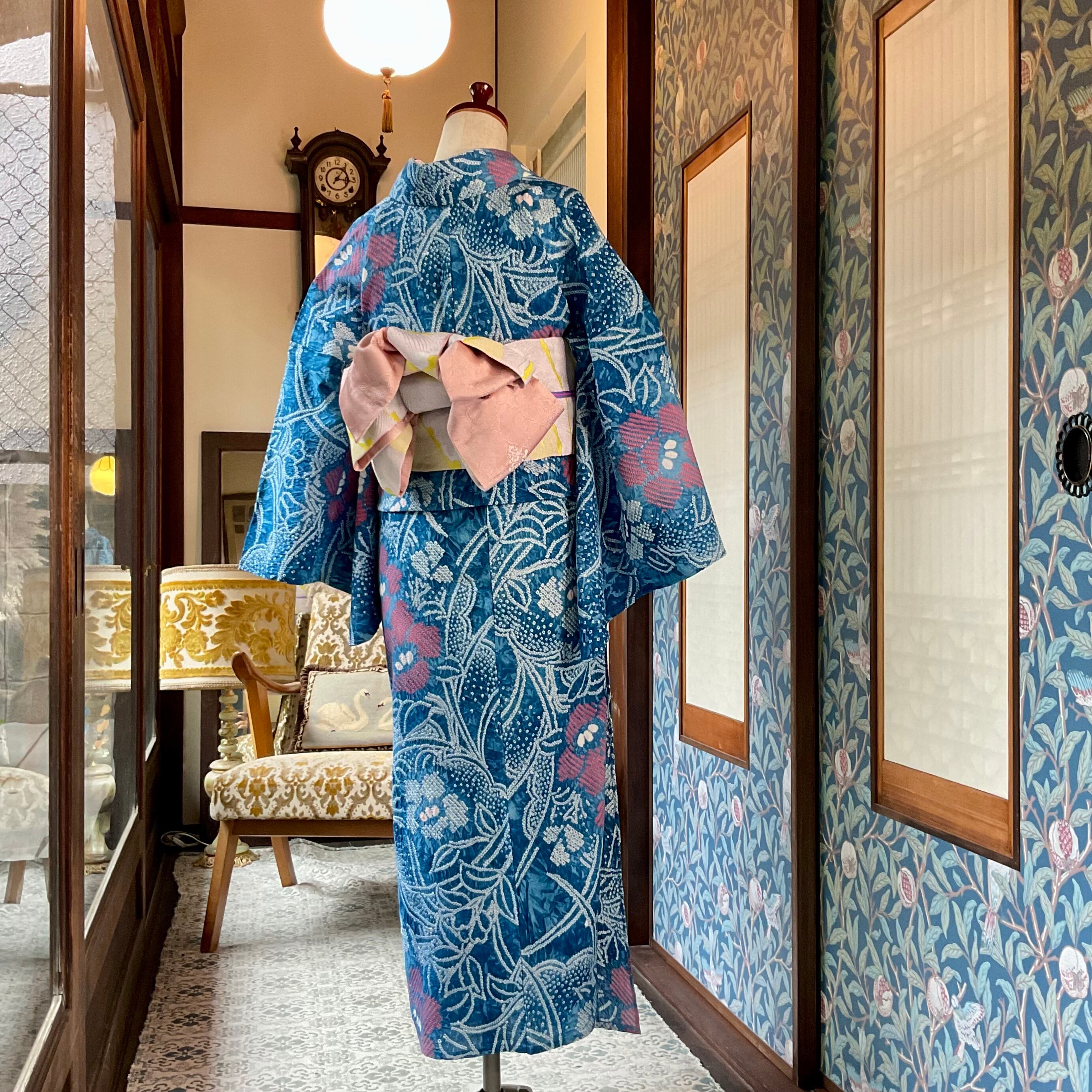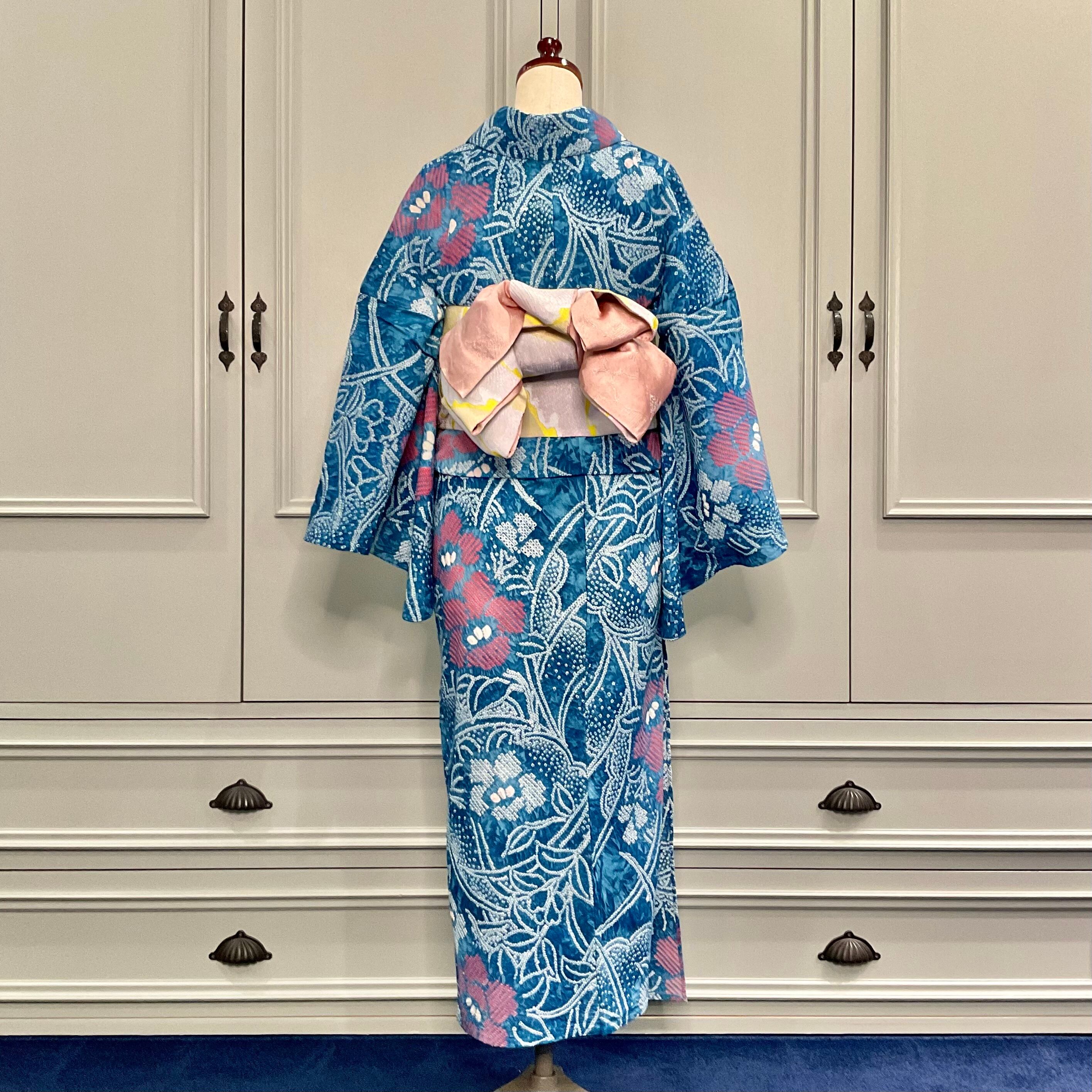 tall*海風にゆれる花*コバルトブルー 水色 青 花 大人浴衣 有松鳴海絞り浴衣 B169