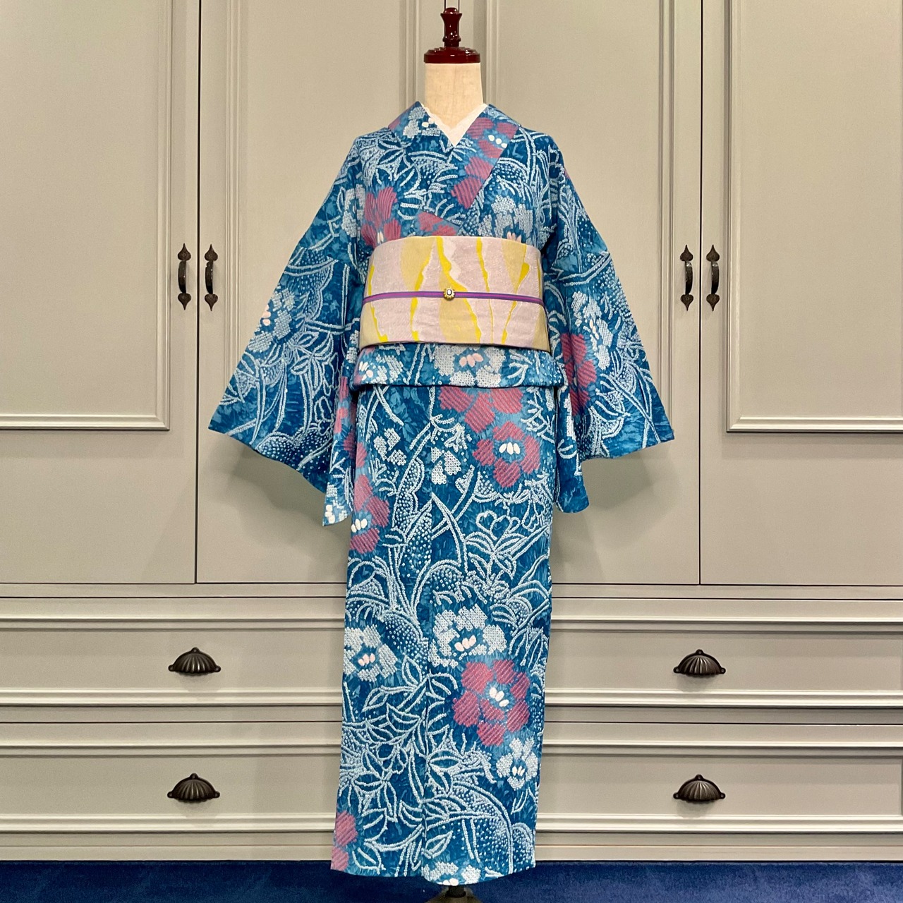 鮮やかなコバルトブルーに、お花の絞り模様が全面に描かれた有松鳴海絞り浴衣です
