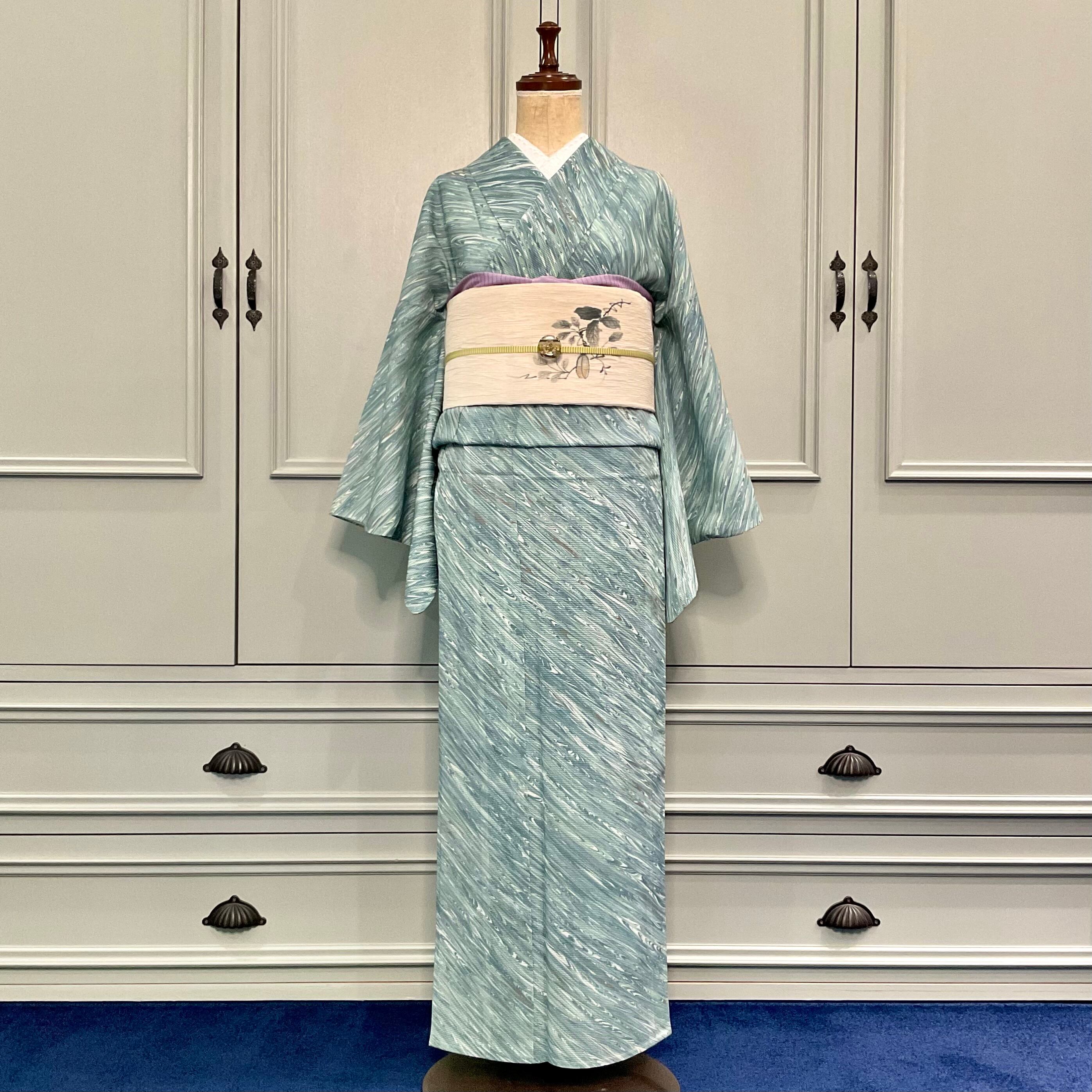 くすみブルーの墨流しの模様がお洒落な絽の夏着物(小紋)です