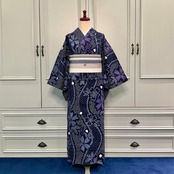 藍色と白色のコントラスト、アクセントに紫色や桃色で彩られ、スッキリと大人の装いを楽しめる一枚です♫