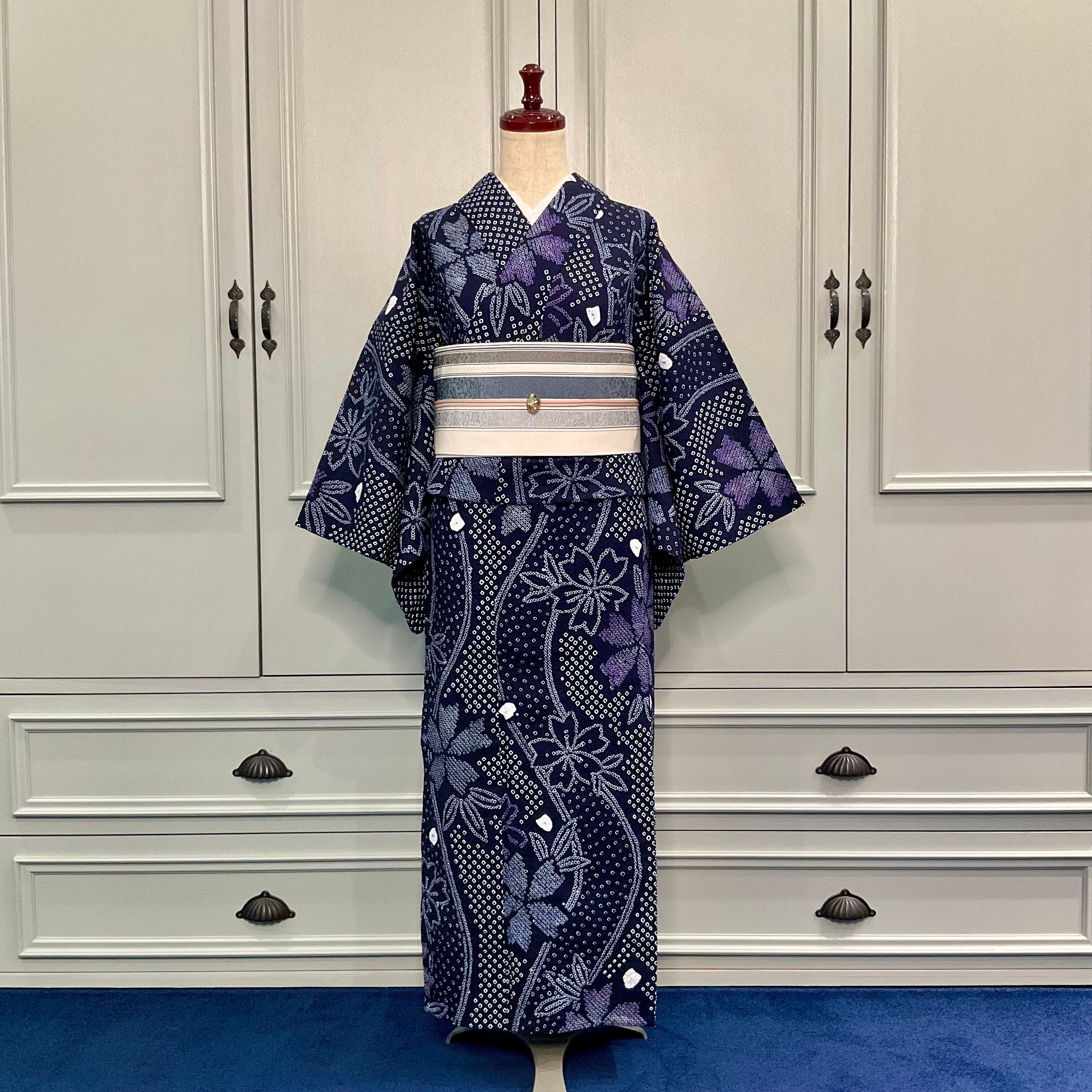 濃紺の地色に、白色×紫色にお花と涼やかな流水模様が美しい有松鳴海絞り浴衣です