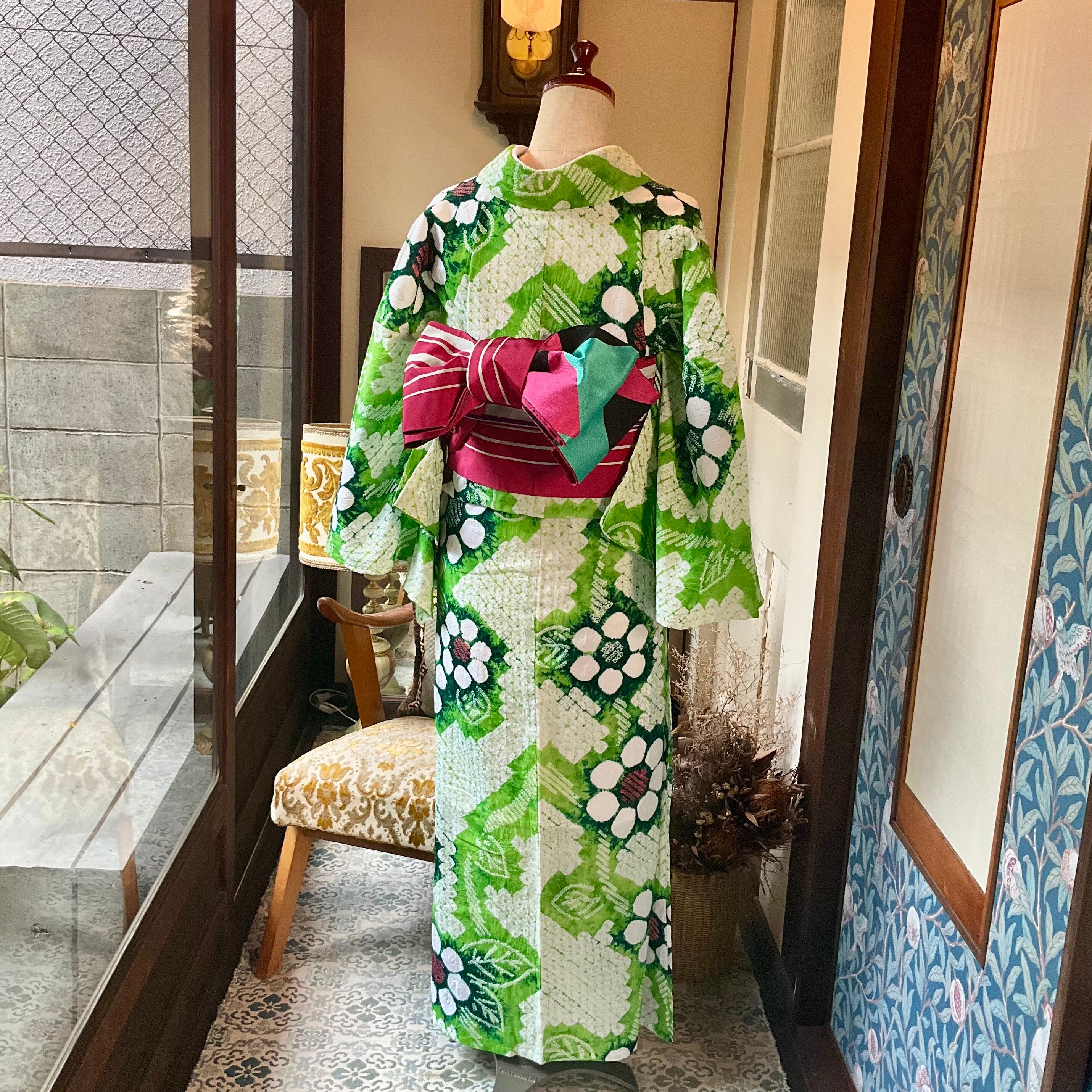 白地に、大きな緑の可愛らしい花模様が目を惹く有松鳴海絞り浴衣です