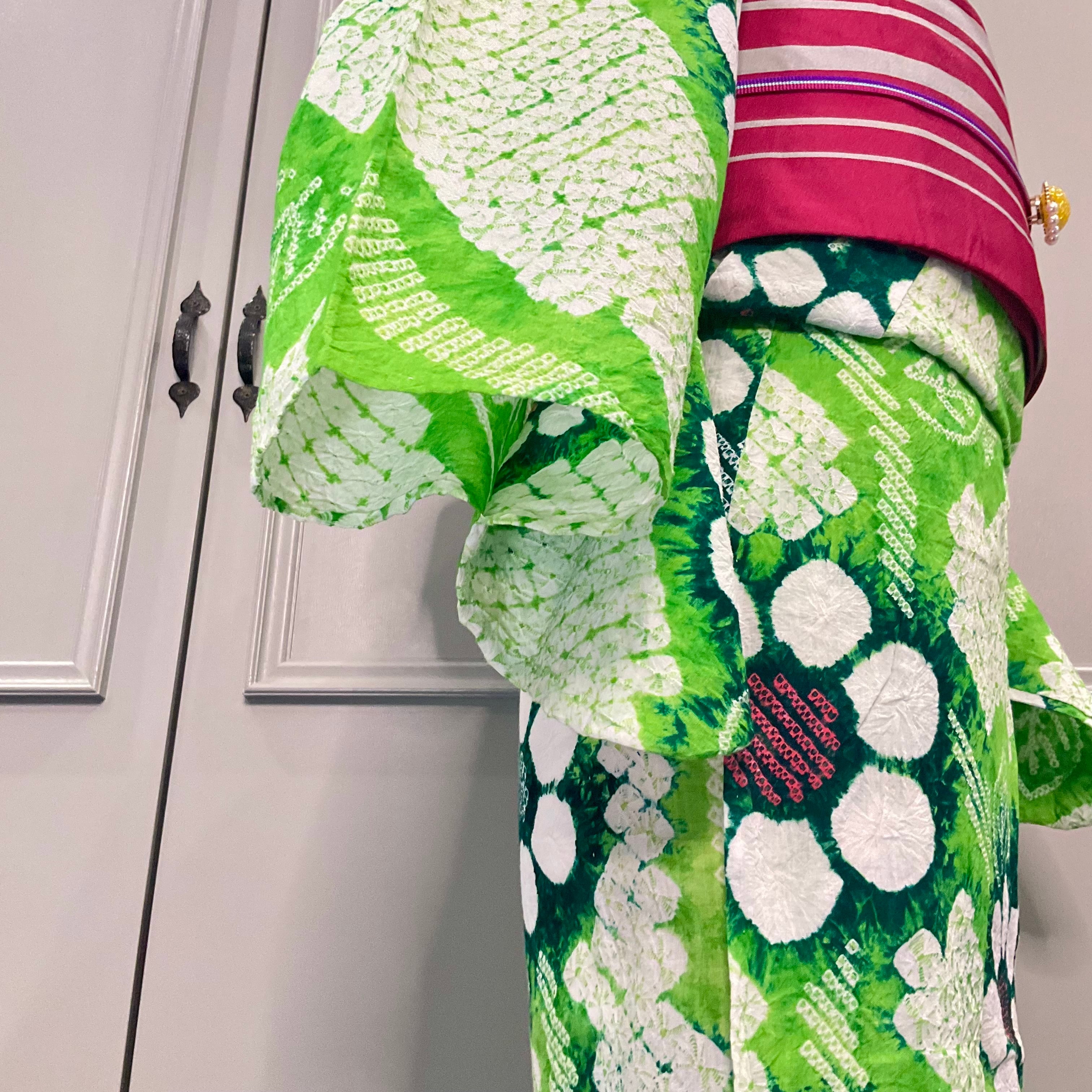 フレッシュさを感じる緑に白抜きの絞り模様は、パワーと元気が溢れ、夏の暑さを吹き飛ばしてくれそうな1枚ですね