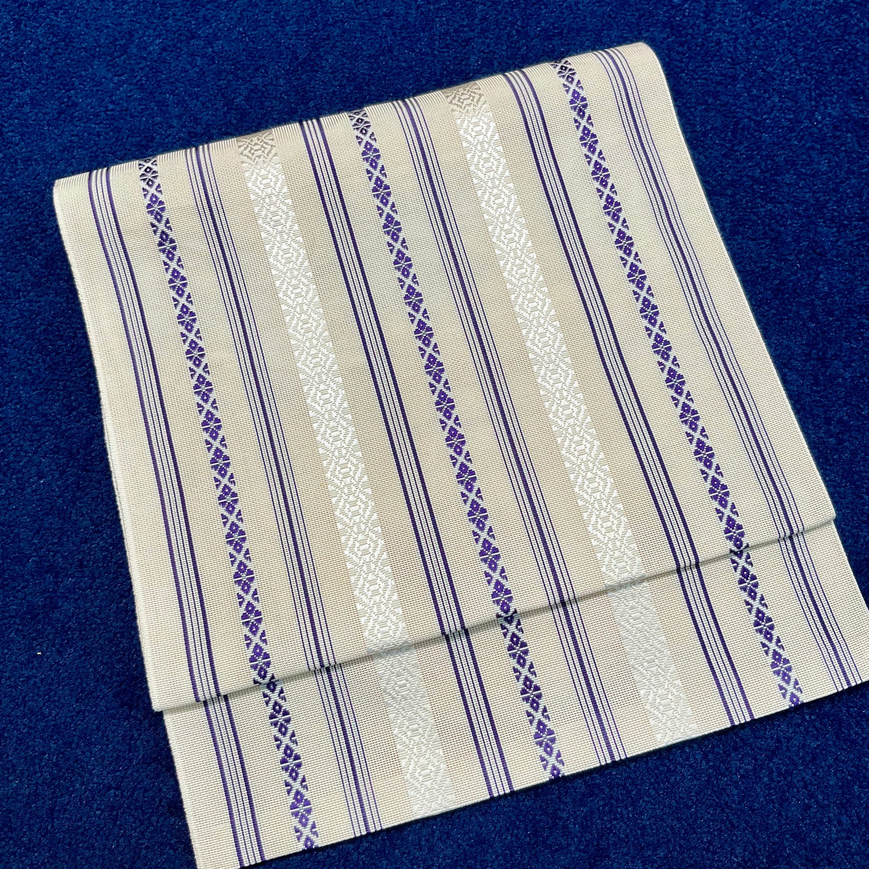 生成の地色に、透けるような絹織の美しさで織り上げられた茄子紺色の献上柄は、キリッと大人の雰囲気