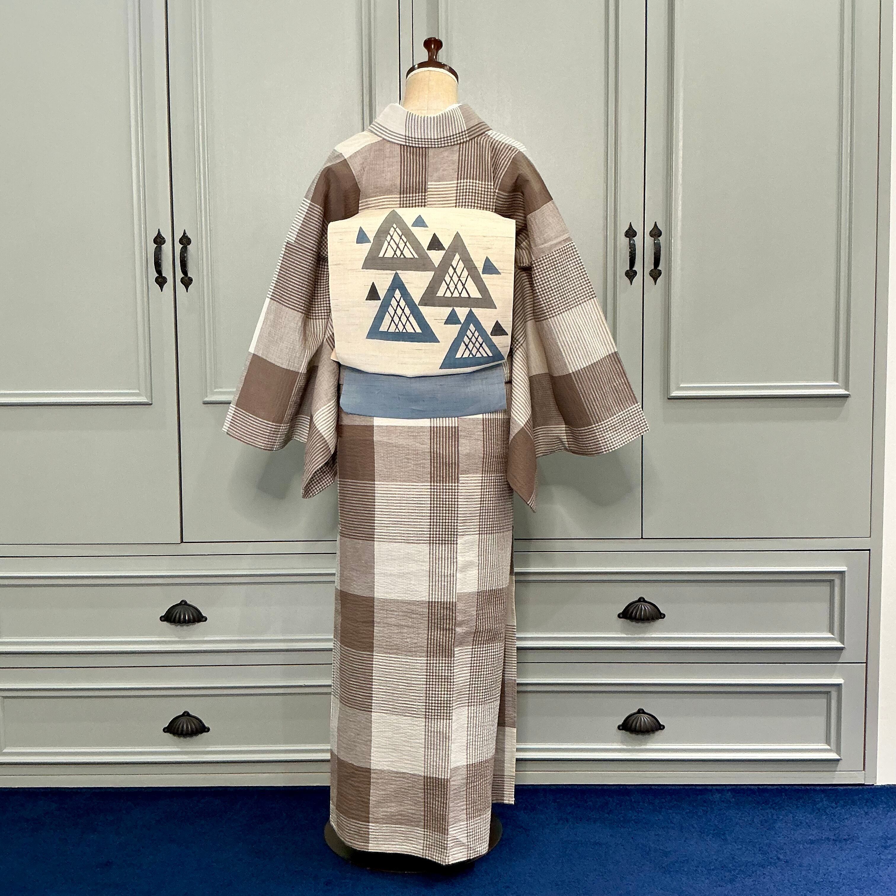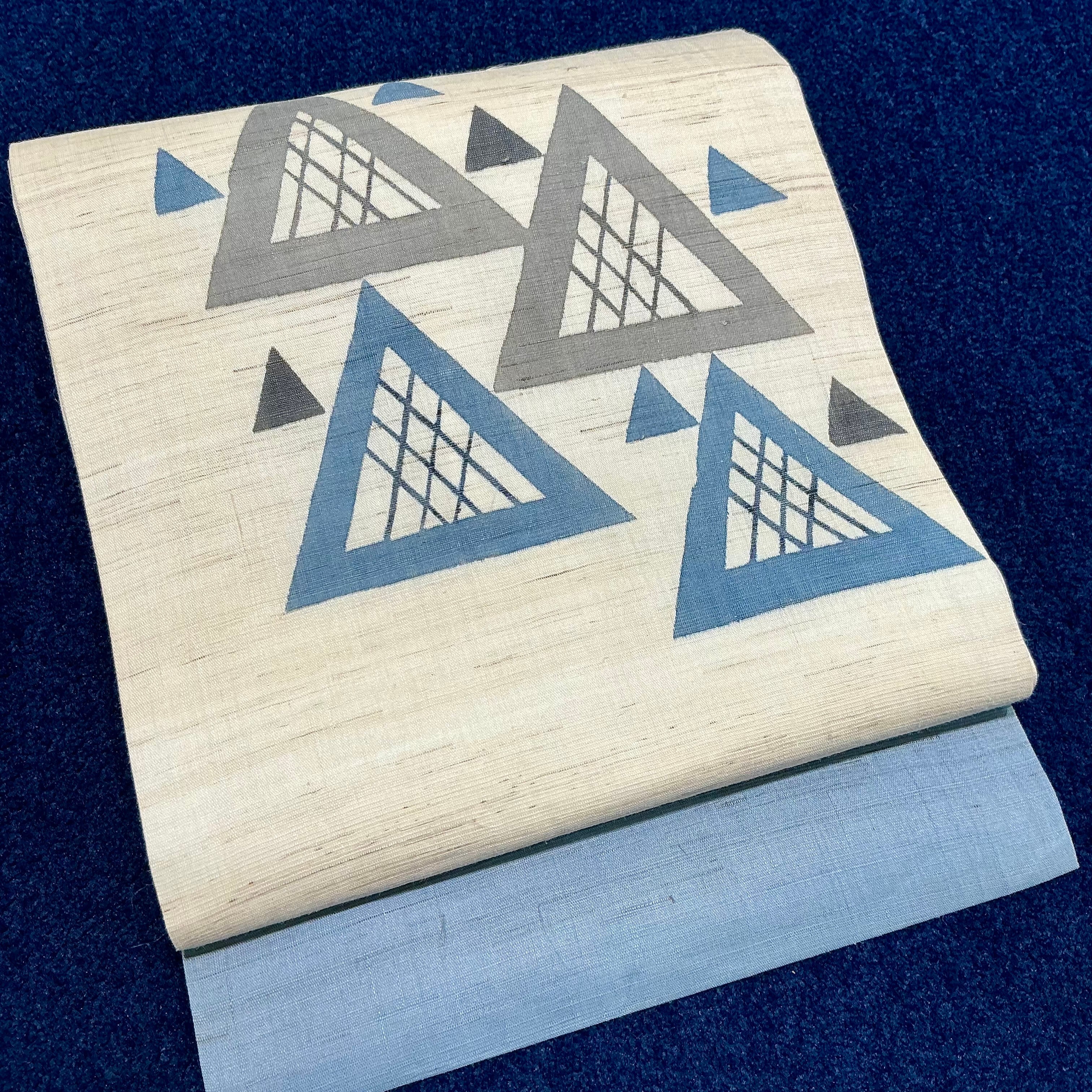 ベージュの地色にブルーとグレーの三角模様がシンプルながらも洒落た麻の名古屋帯です