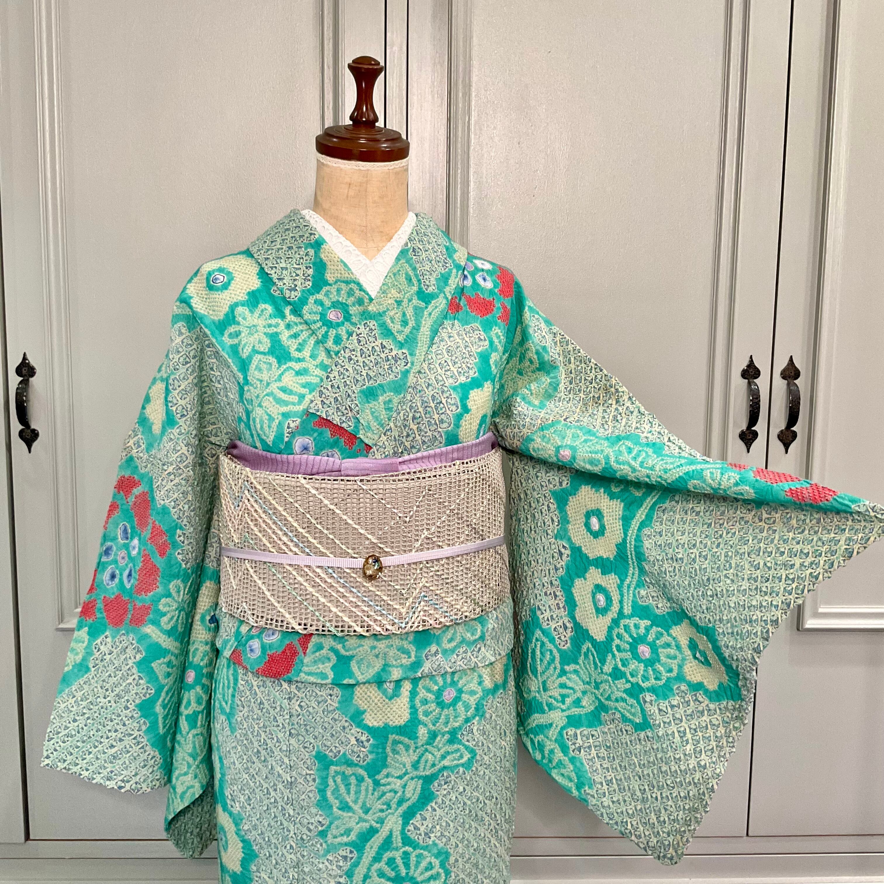 鮮やかなエメラルドグリーンの地色に、花模様が美しい有松鳴海絞り浴衣です