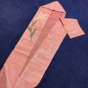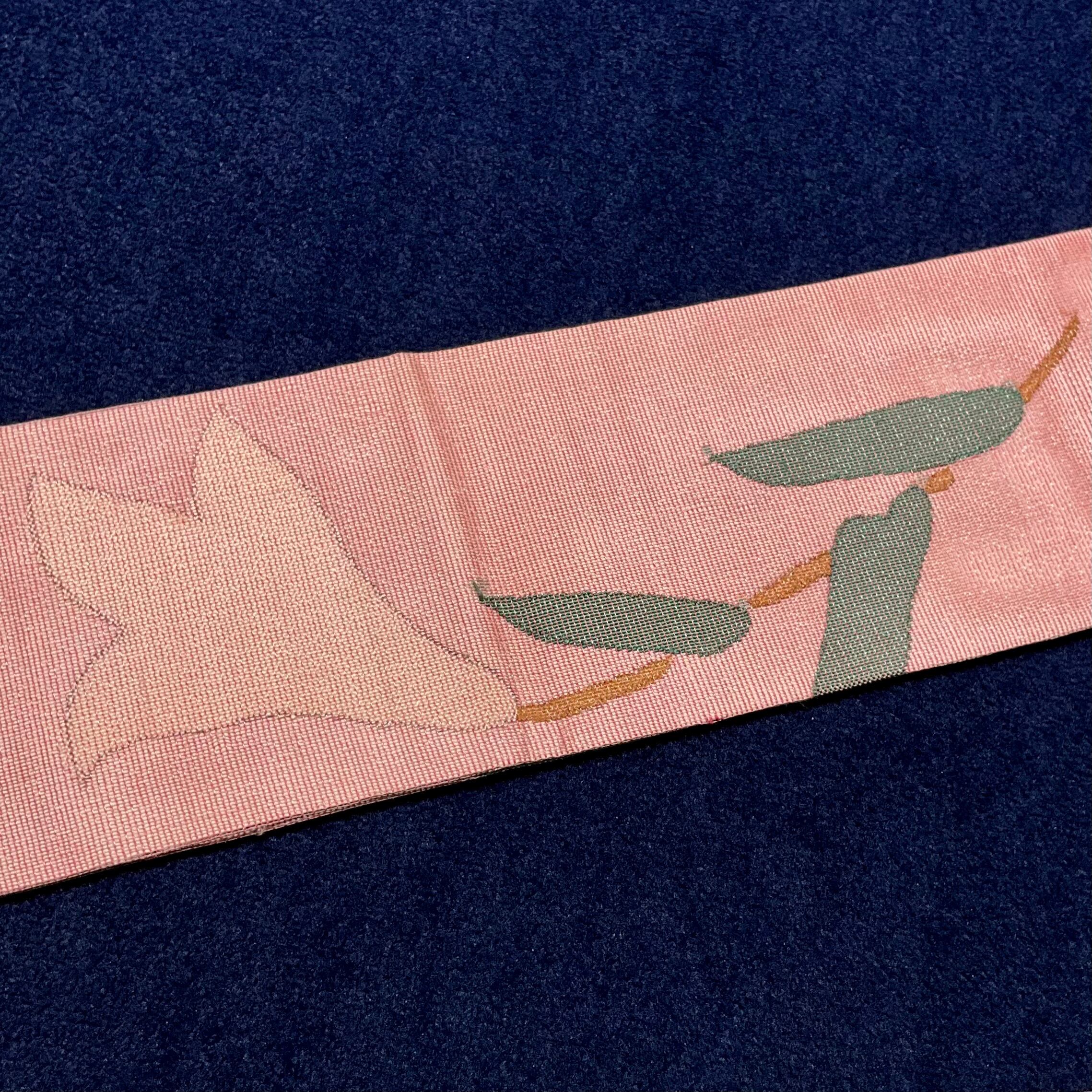 紗のベビーピンク地に、大きな白百合の織り模様が美しい夏のアンティーク名古屋帯です