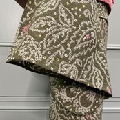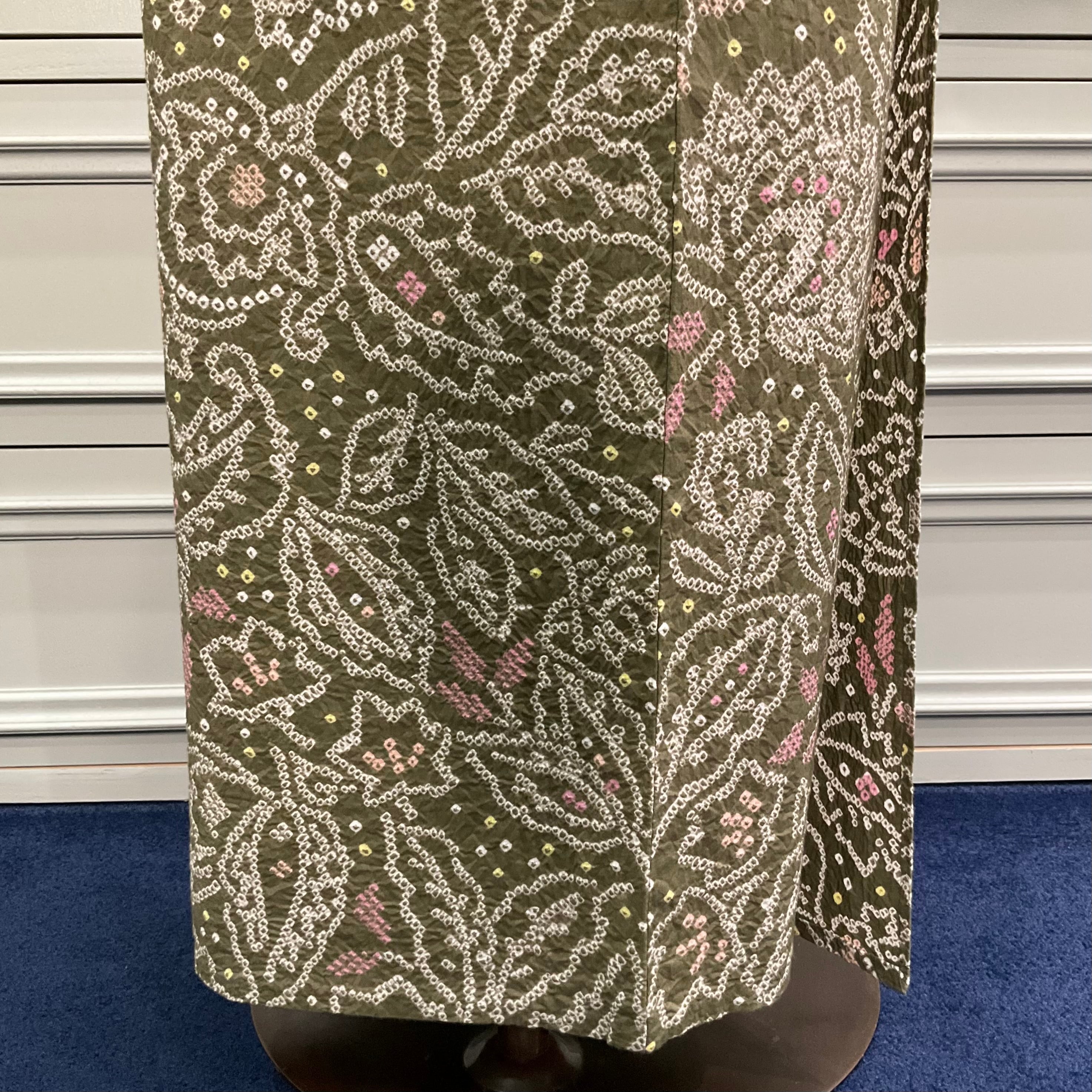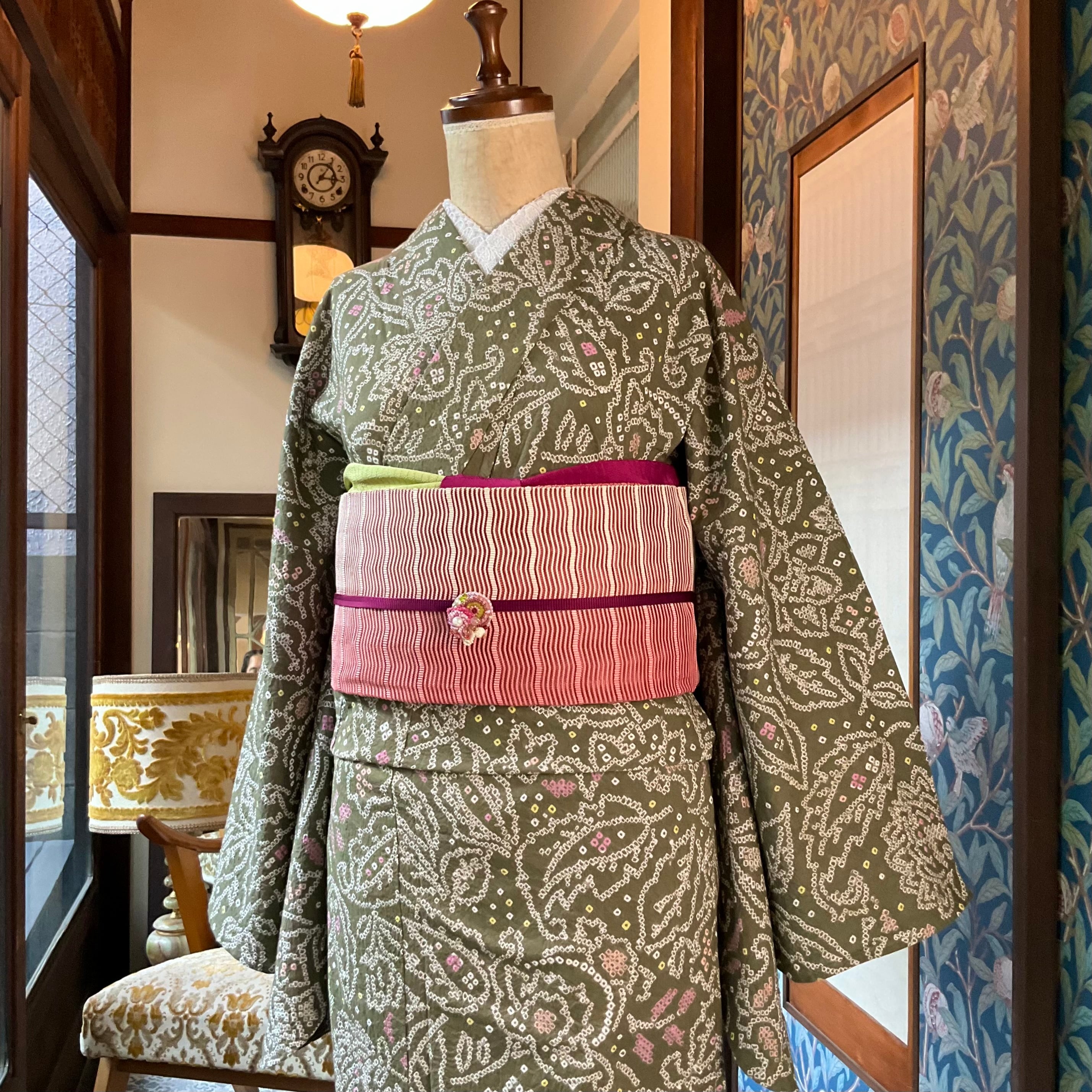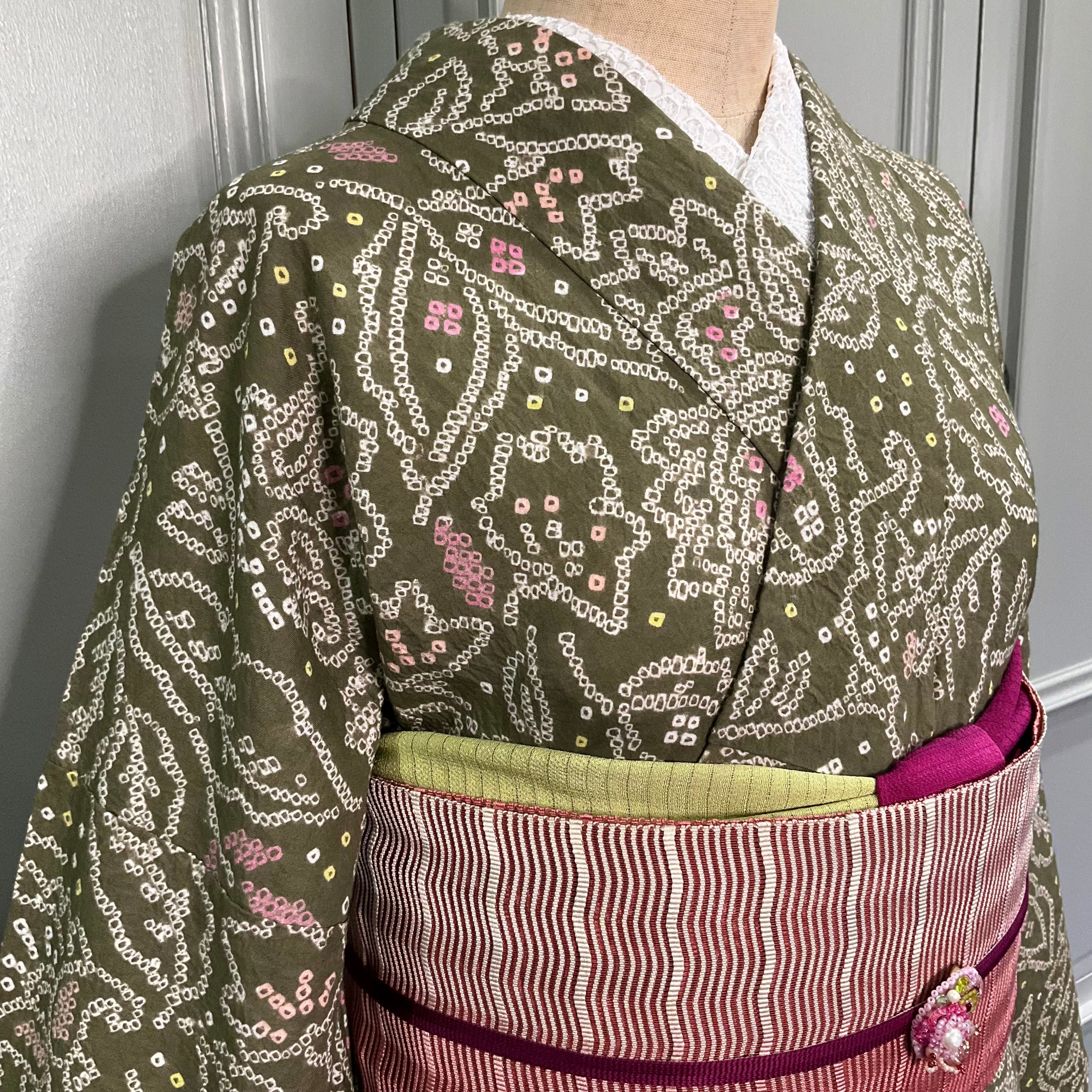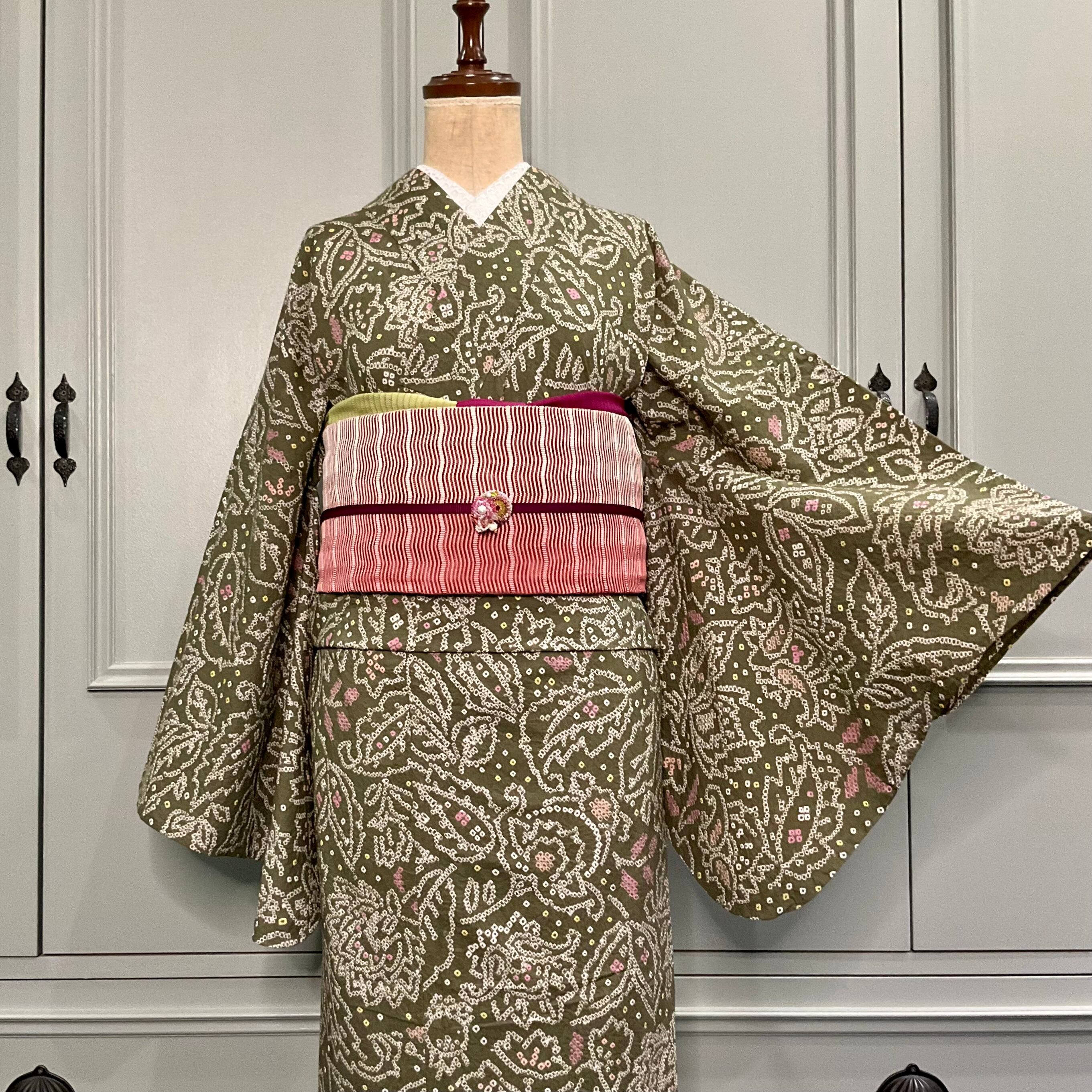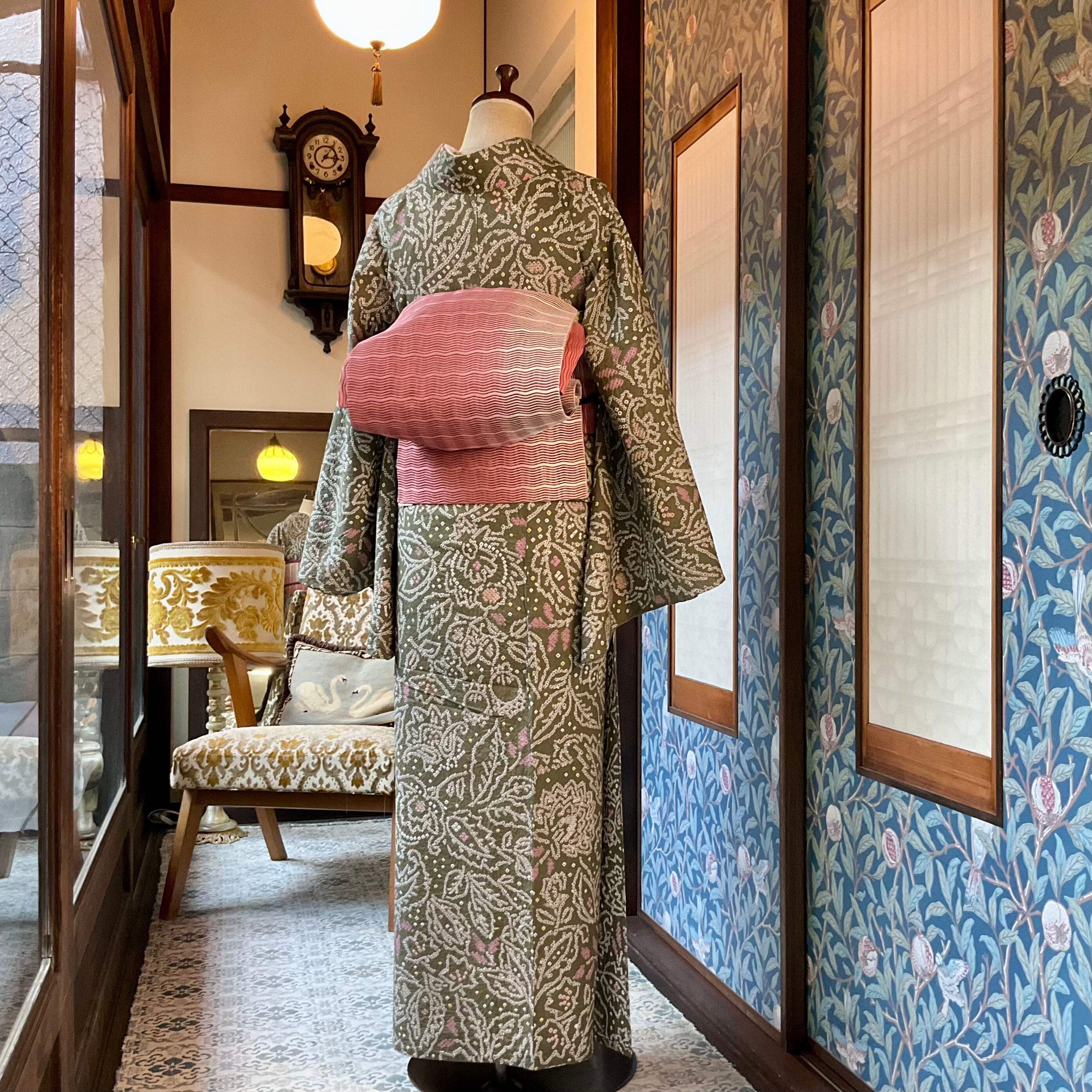 モスグリーンの地色に更紗模様が絞りでデザインされた美しい有松鳴海絞り浴衣です