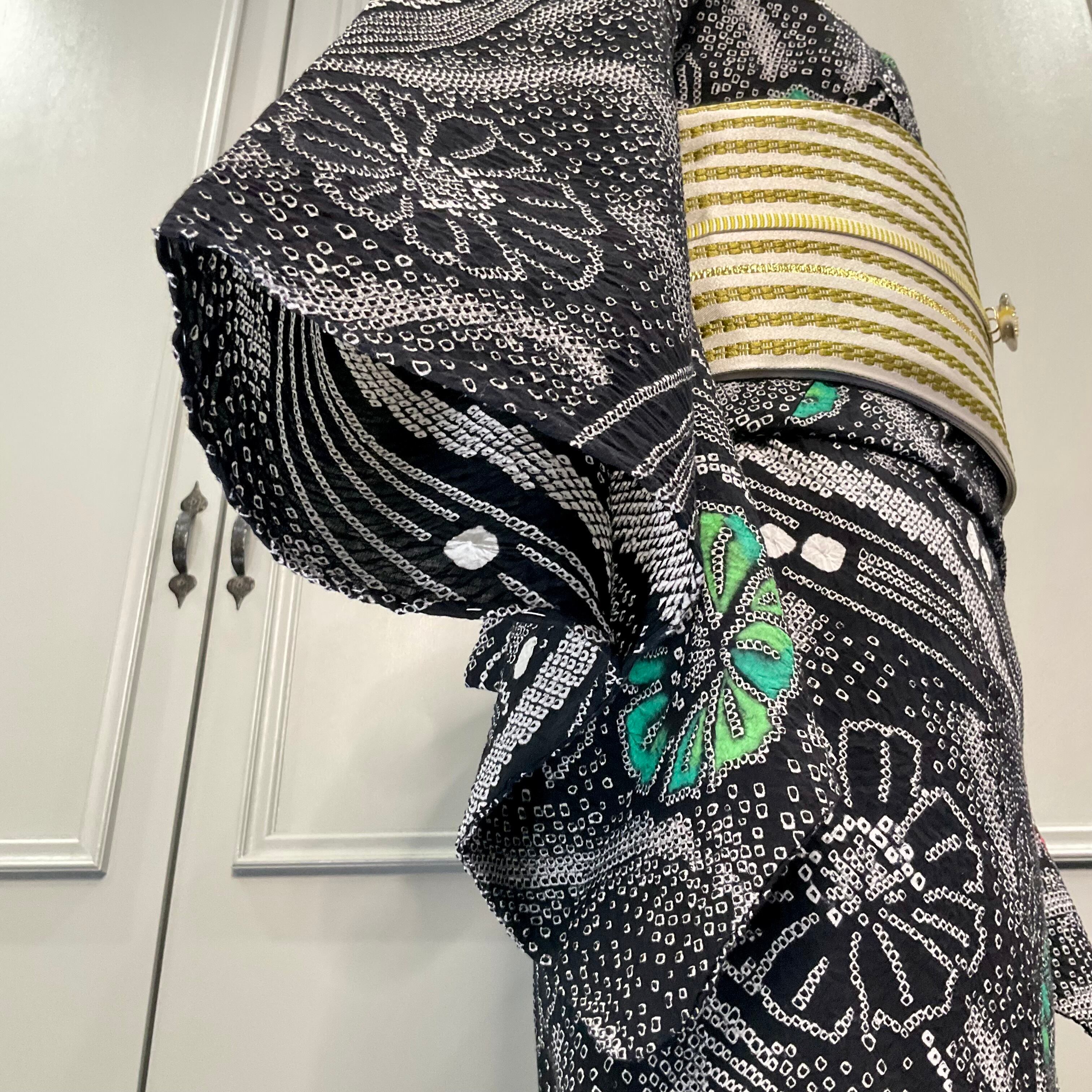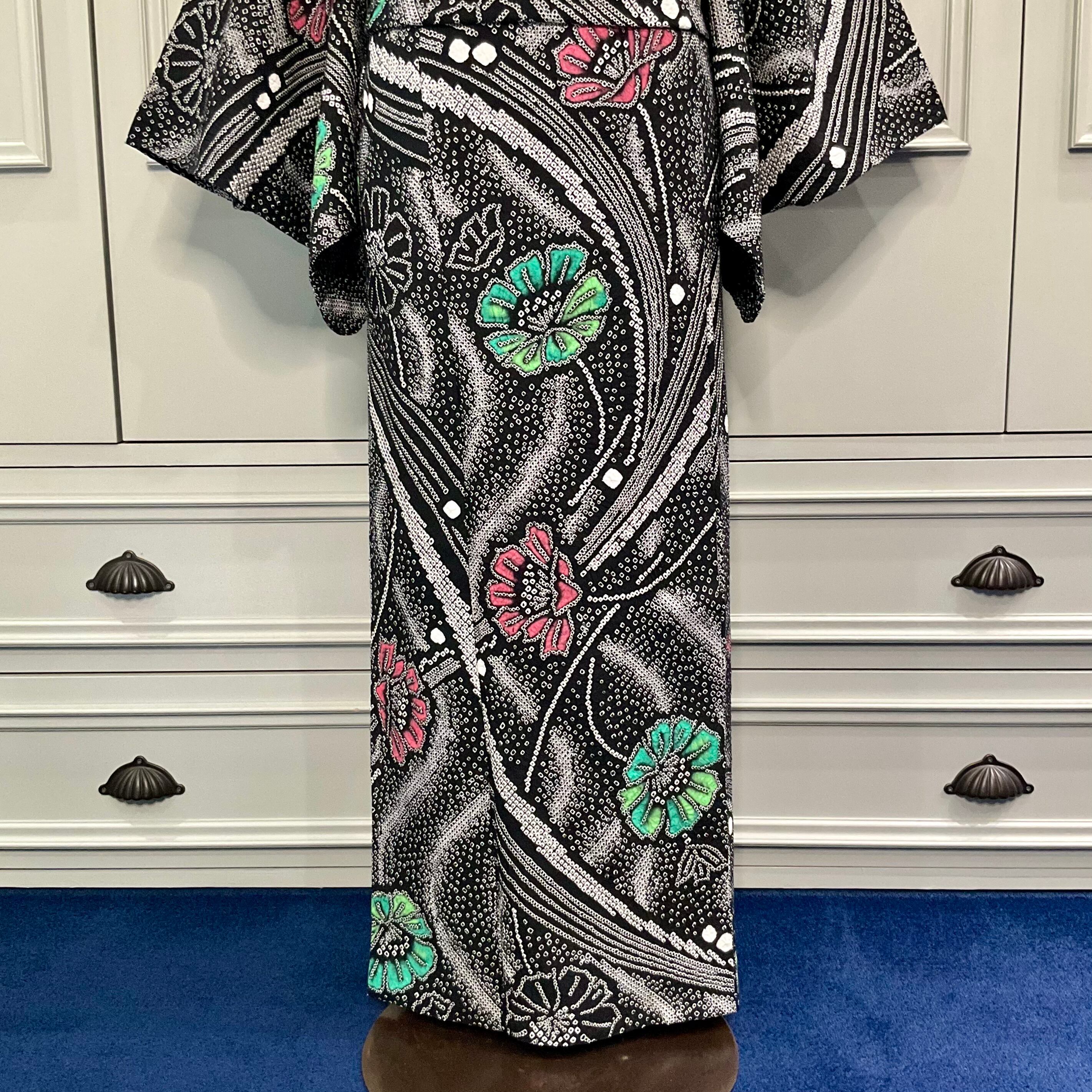 ブラックの地色に、細やかなあぶくのような絞り模様と色鮮やかなお花が美しい有松鳴海絞り浴衣です