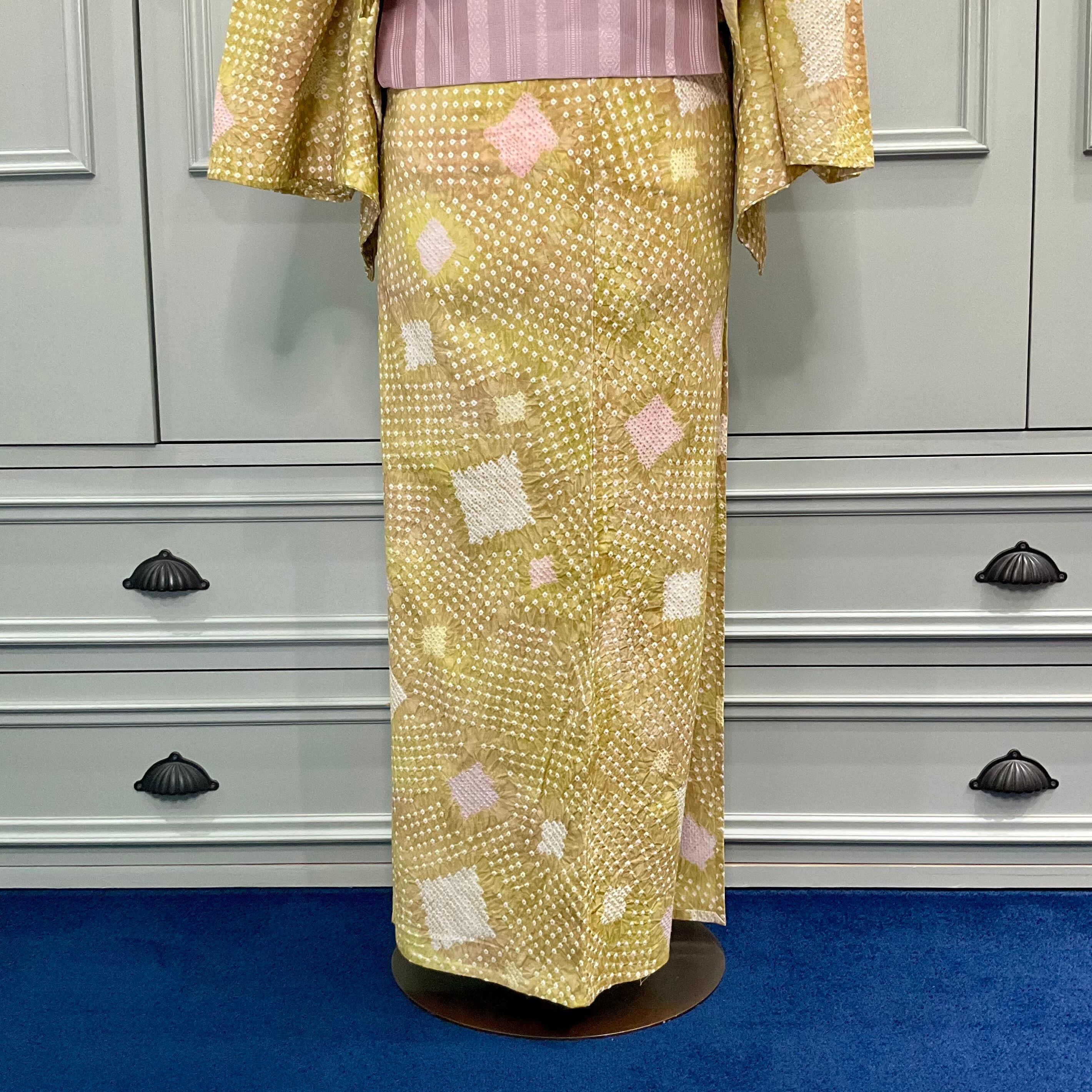 やわらかいイエローの地色に、ホワイトやピンクのスクエアの絞り模様がステキな有松鳴海絞り浴衣です