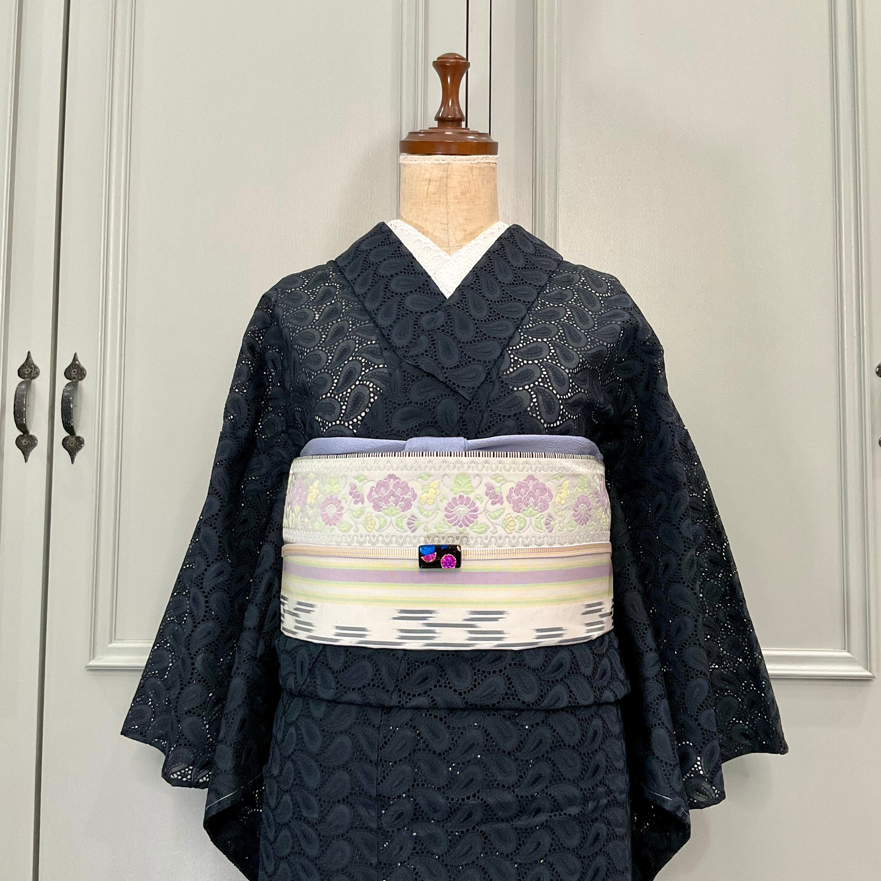 ブラックの地色に勾玉柄の綿レースが大人かわいい単衣仕立てのレース着物です