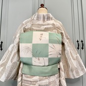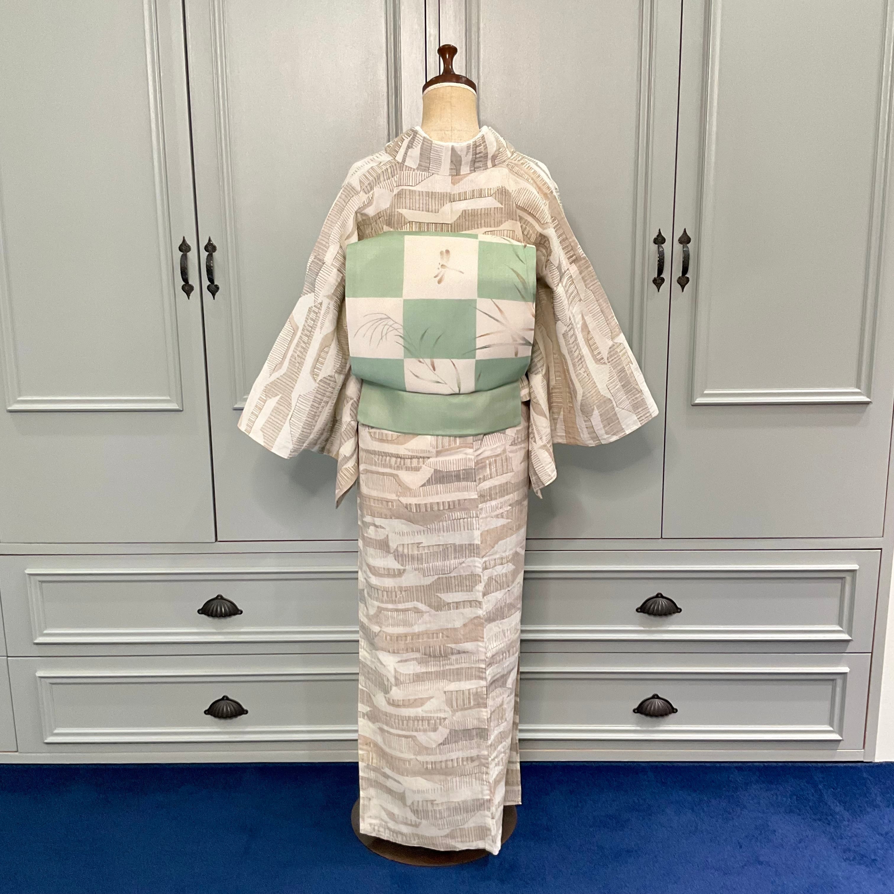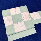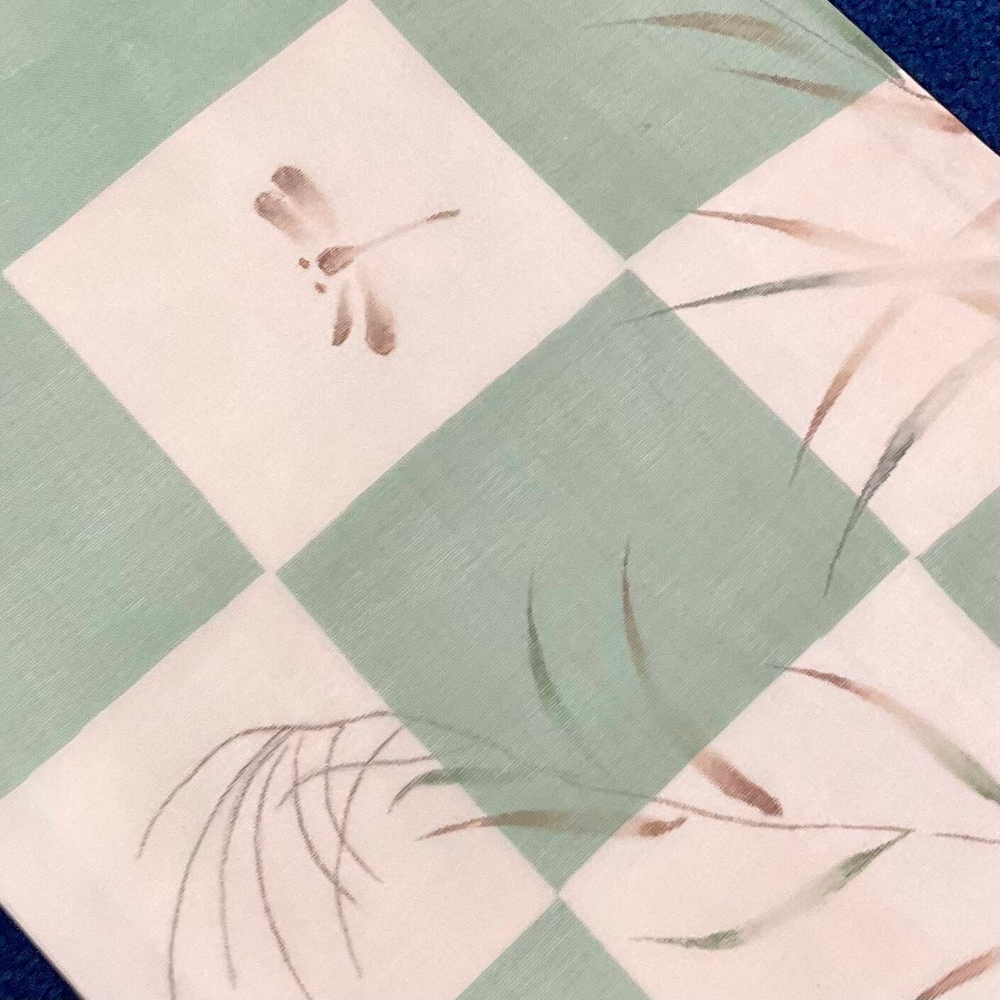 アイボリー×アイスグリーンの市松模様に、風になびくススキの穂とトンボが、ちょっぴり秋を感じさせる大人の雰囲気あふれる一枚