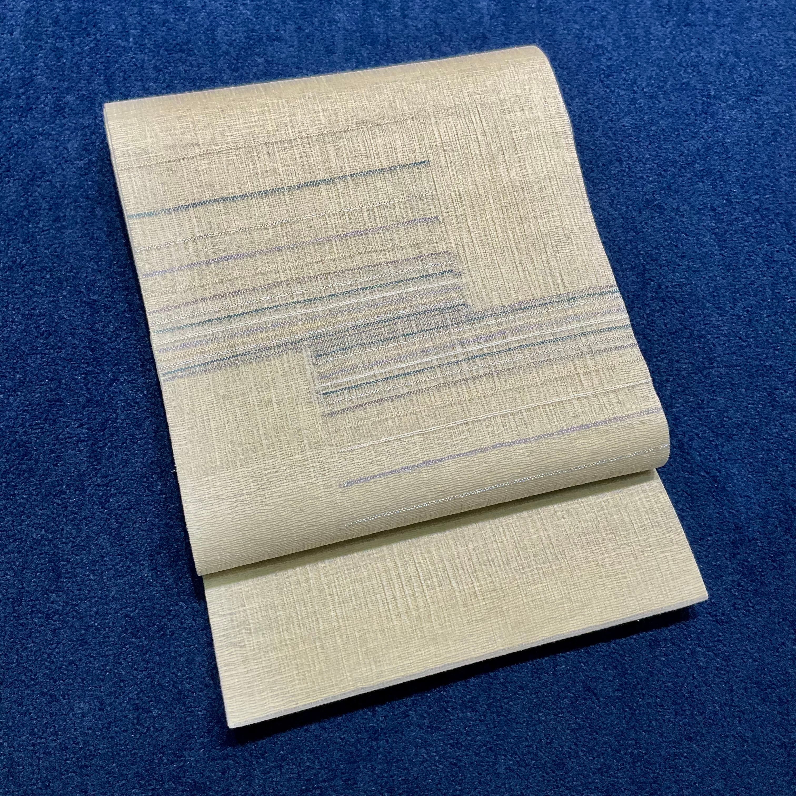 生成り色の地に、植物の模様と、ボーダーラインの2つのデザインが愉しめるリバーシブルの洒落袋帯です