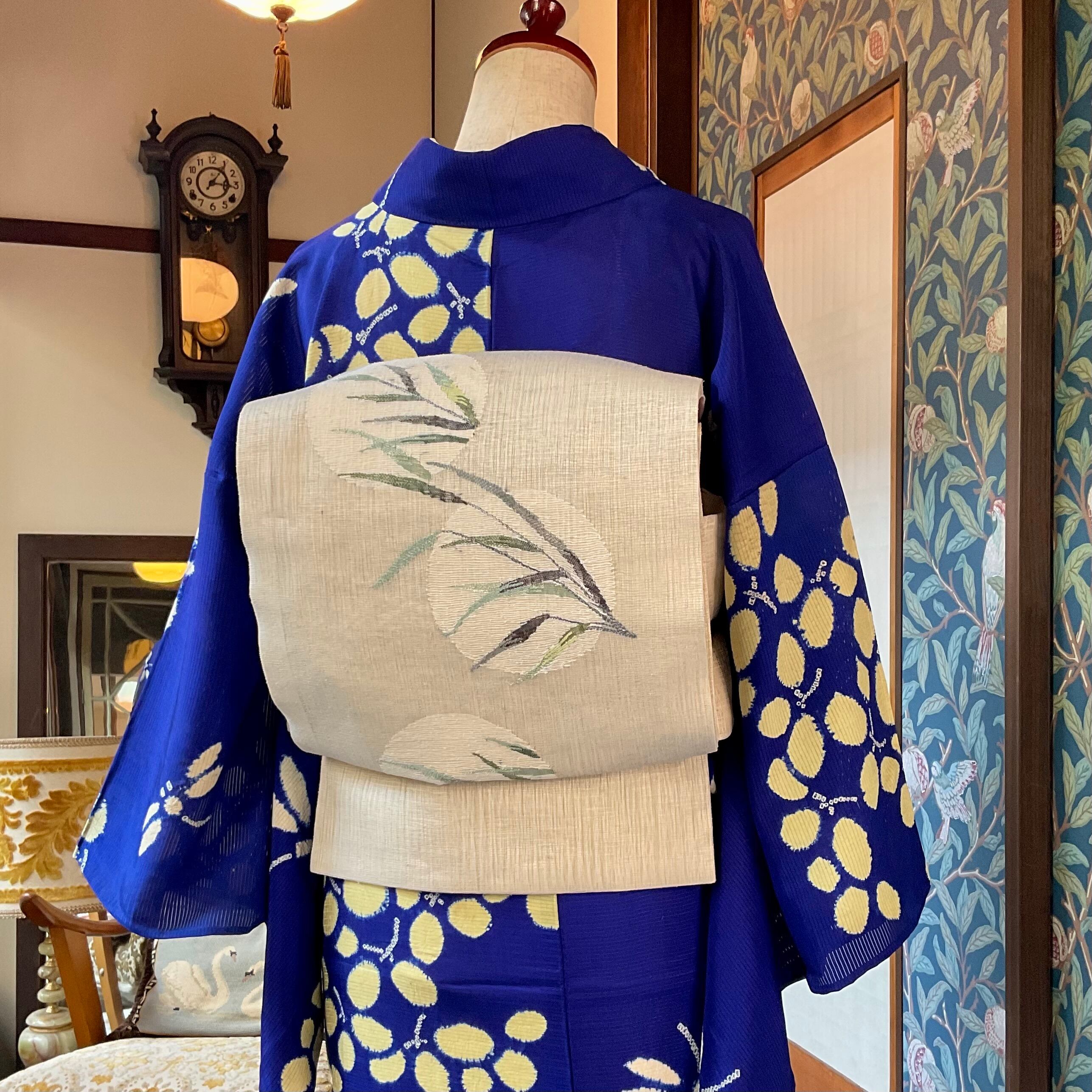 ロイヤルブルー地に、やさしい黄色の萩の葉と、生成り色の蜻蛉の絞り模様が目を惹く、絽のアンティーク夏着物です