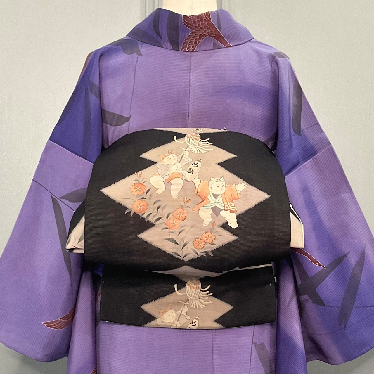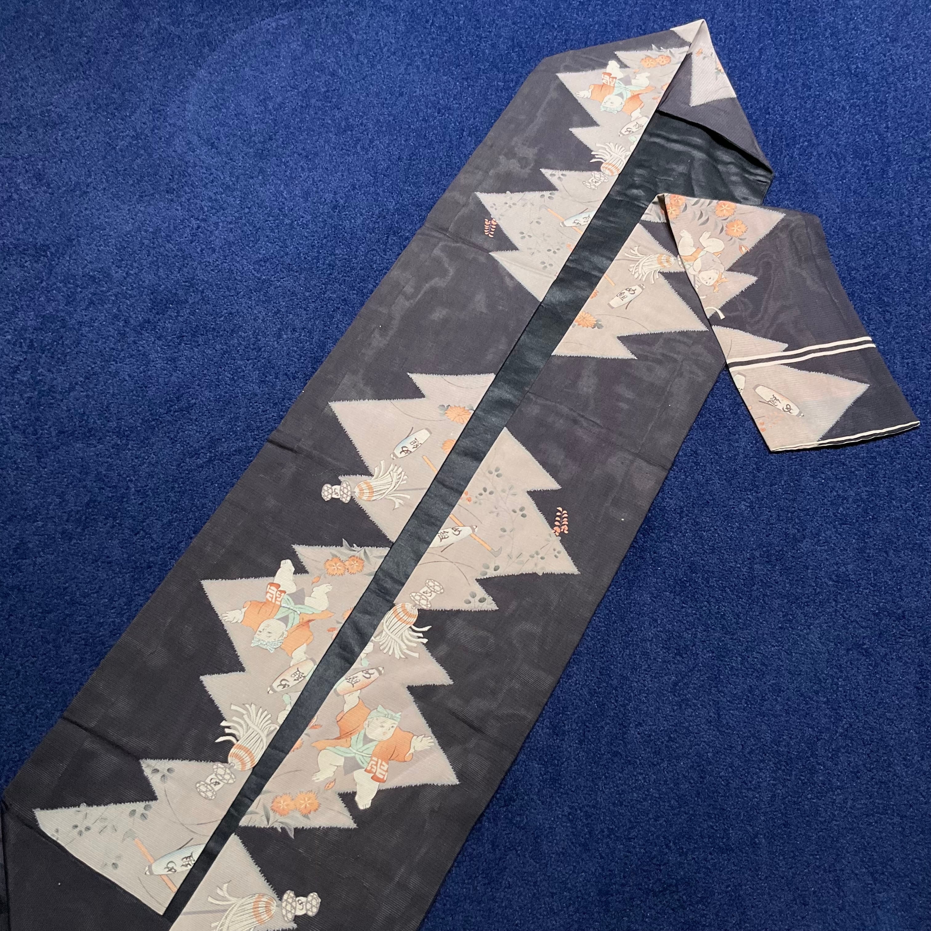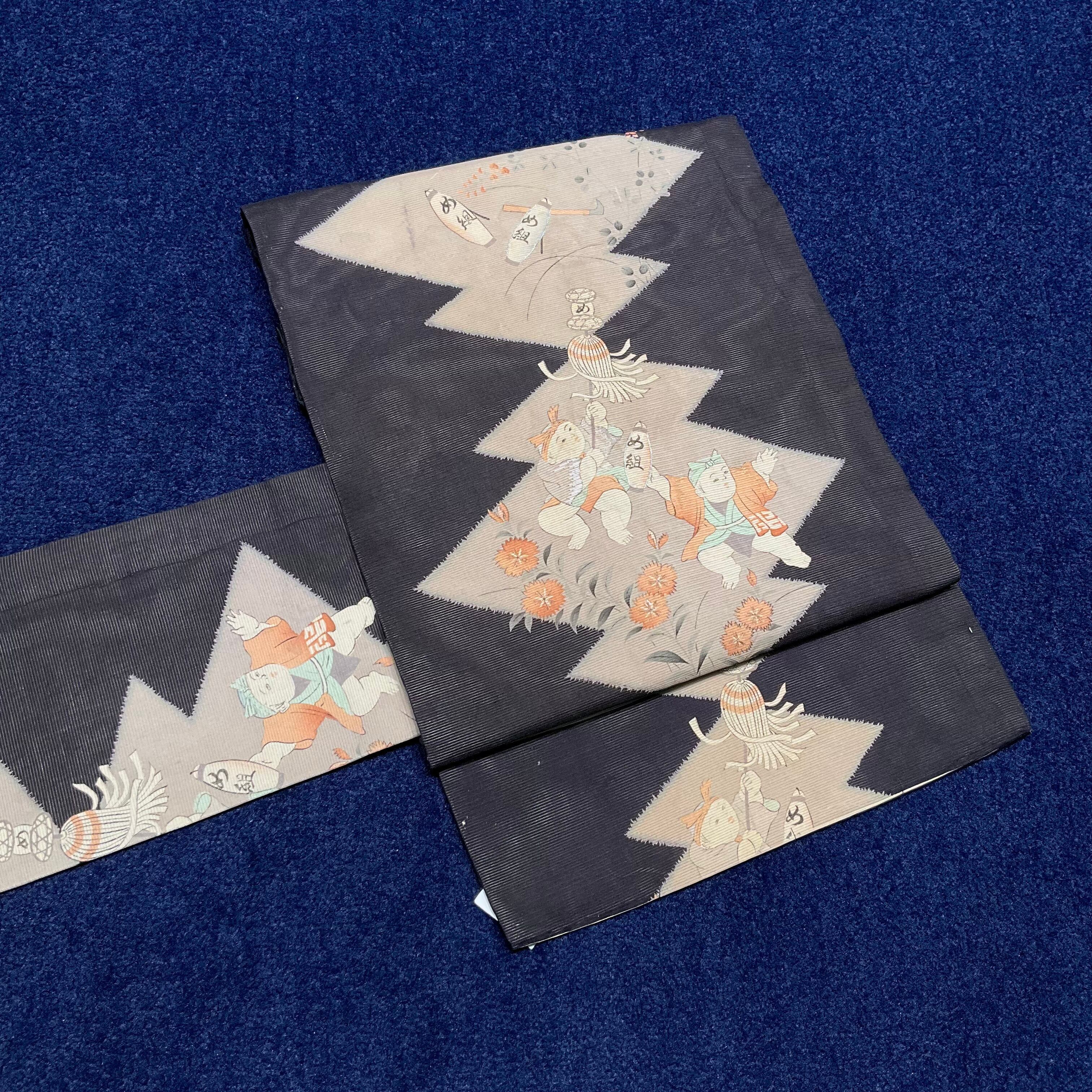 墨黒の細かい絽の生地に、淡い灰色の松皮菱模様と、童子の火消しの模様が愉快な、夏のアンティーク名古屋帯です