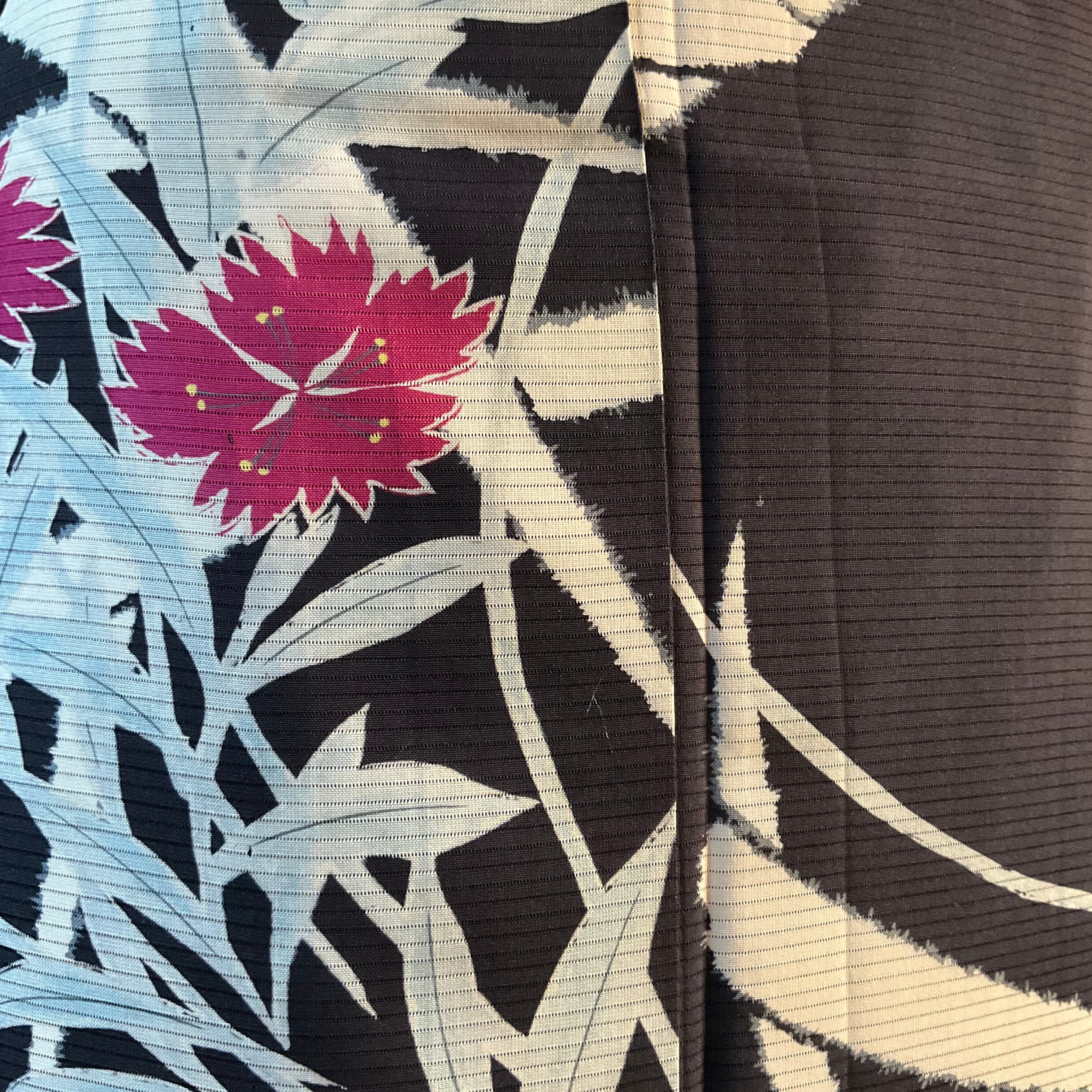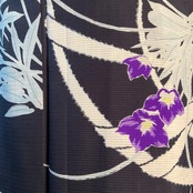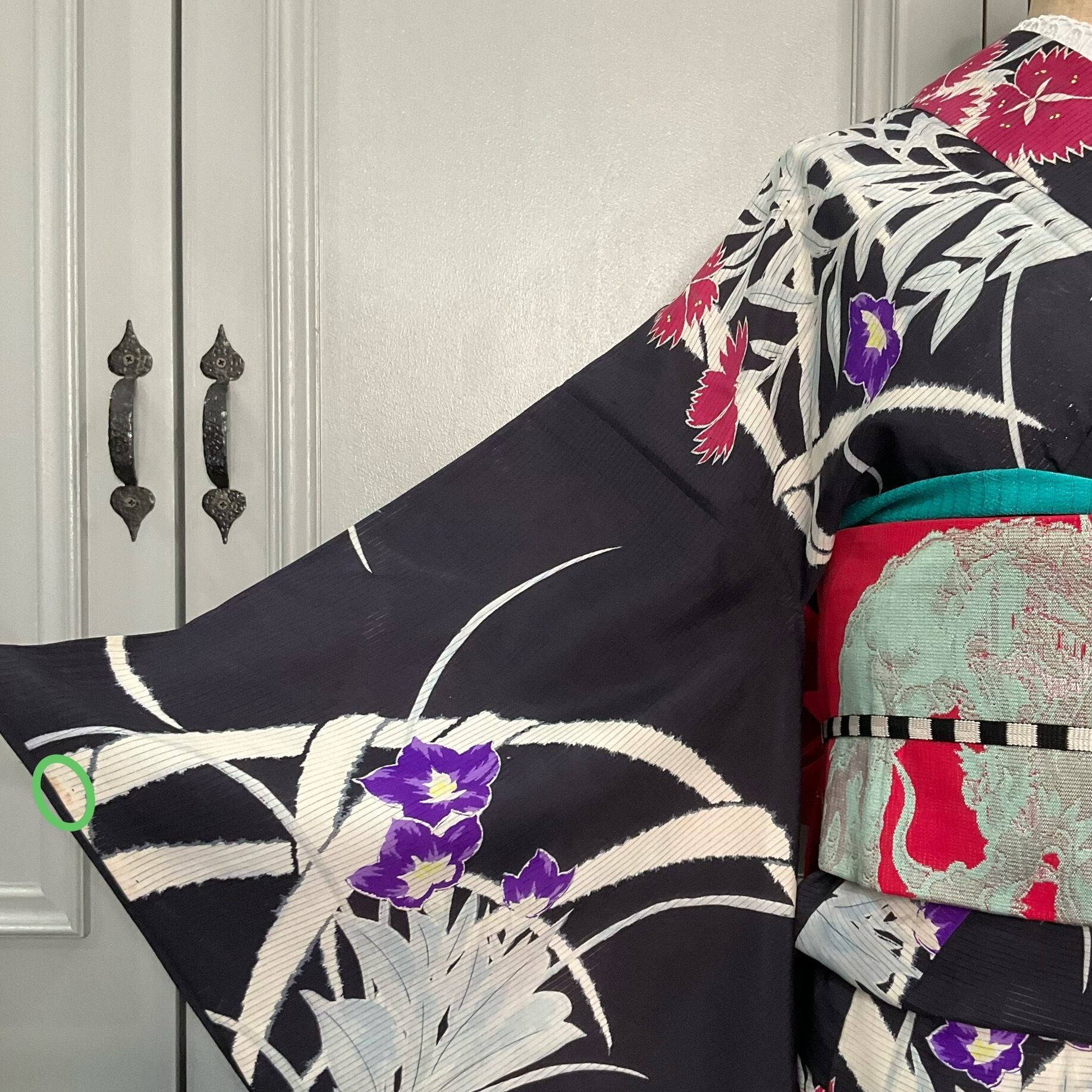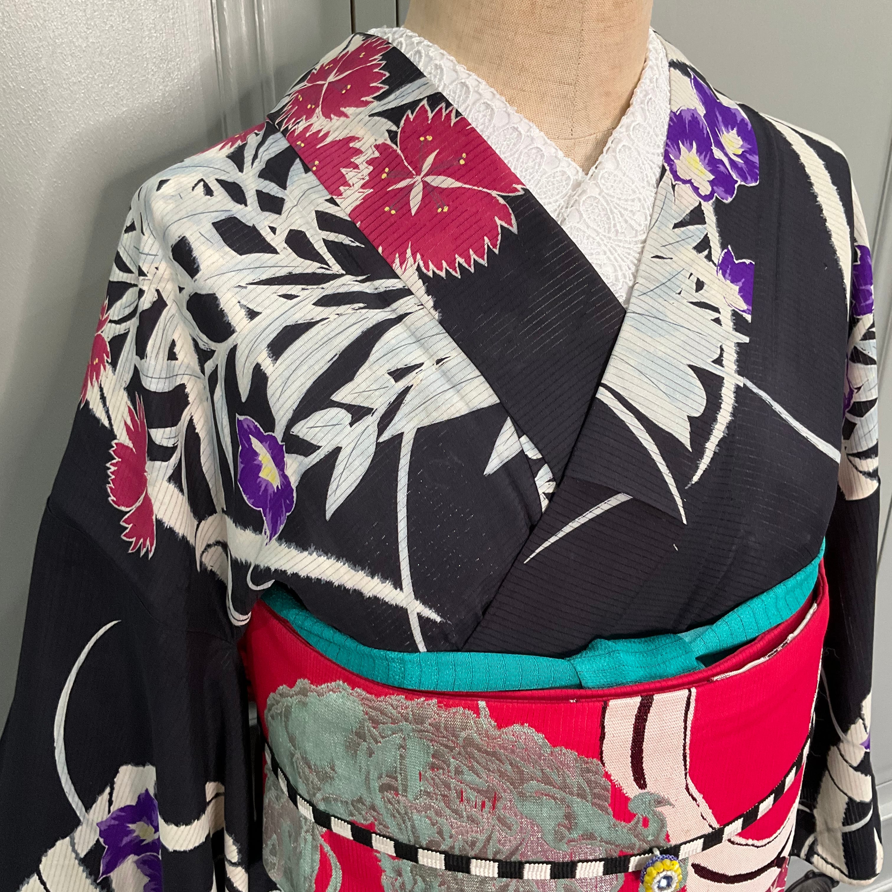 黒地に、紫の桔梗と、マゼンタの撫子が描かれた絽のアンティーク夏着物です